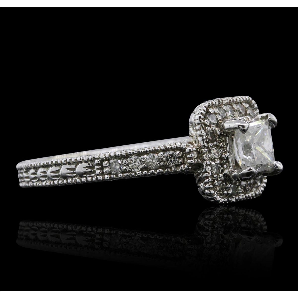 14KT White Gold 1.33ctw Diamond Ring A7882. New Condition! RG6151GB. One electronically tested 14KT white gold lady's combination cast & die struck ring & wedding band with a antiqued finish. Condition is new. Identified with markings of "14K". Containing: One prong set princess cut diamond, measuring 4.80 x 4.70 x 3.53mm (depth est.) approximate weight of 0.72ct. Clarity of I-3, Color of I, Cut is Good. Twenty-Four prong set round brilliant cut diamonds, measuring 1.60 - 1.60 x 0.96mm (depth est.) approximate total weight of 24 Stones = 0.61ct. Clarity of I-1, Color of I - J, Cut is Very Good. Total Weight of Diamonds 1.33ct. Total Weight of Ring & Wedding Band 6.10gm. GGL Appraised at $5,660.00.