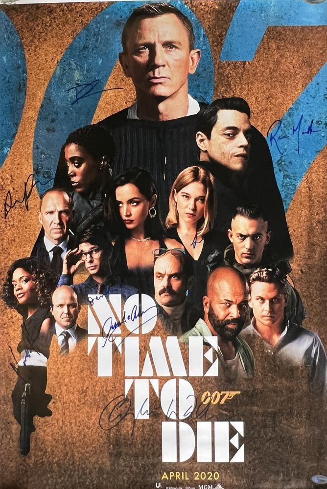 No Time To Die cast signed movie poster autographed by Daniel Craig, Ana de Armas, Lea Seydoux, Ralph Fiennes, Rami Malek, Christoph Waltz, Naomi Harris and Ben Whishaw. 24x37 inches. GFA Authenticated