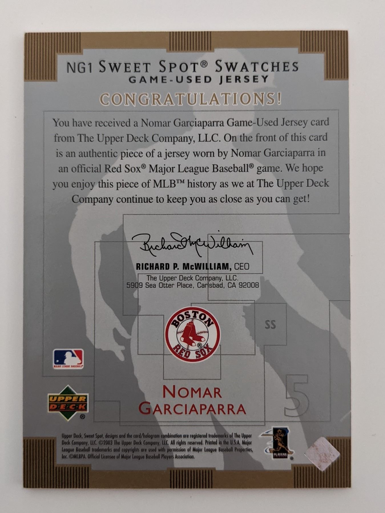 Nomar Garciaparra Baseball Trading Card with Game Used Jersey Swatch - Upper Deck Sweet Spot #NG1 2003