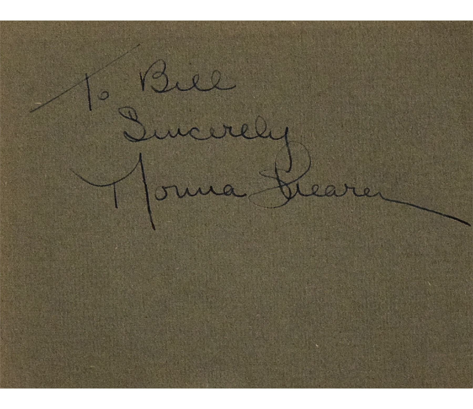 Norma Shearer 4 in. by 3 1/2 in. signature slip autographed To Bill Sincerely Norma Shearer. The To Bill can be cut out or covered up without interfering with Sincerely Norma Shearer.