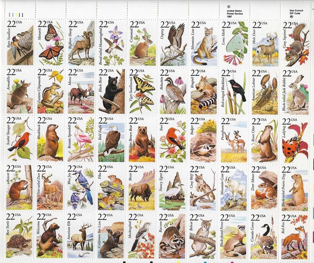 North American Wildlife Sheet of 50 x 22c Stamps, 1987, 2286-2335. issued to celebrate America’s variety of wildlife, and animal subjects were chosen to reflect the geographic and biological diversity of creatures native to this continent. All areas of the United States are represented, including Hawaii and Alaska.