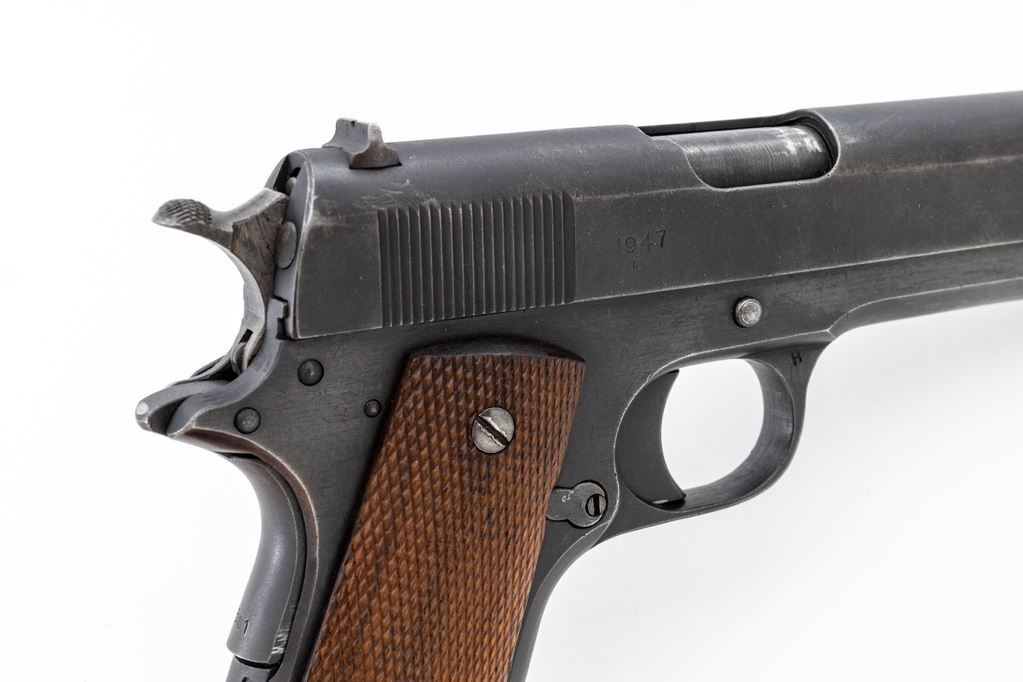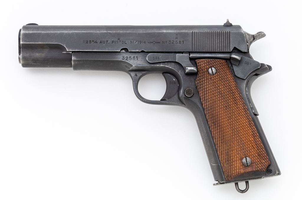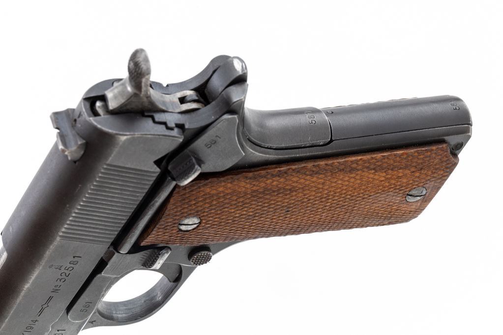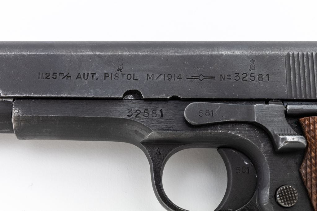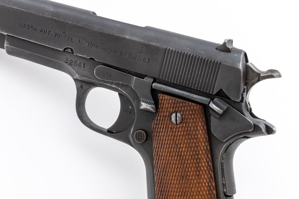Norwegian M/1914 Semi-Automatic Pistol, #32581, .45 ACP cal., 5" barrel, phosphate finish, press checkered walnut grips, and WWI era U.S.G.I. magazine. A late example of a Konigsberg Norwegian service pistol dated 1947, with all visible matching parts, except barrel, which is a WWI "P/H" example. Condition is near excellent with approx. 92% blue/black finish to frame and phosphate finish slide. Although a late pistol, these grips do not appear to be original and show mild flattening. Good action, bright bore. Est.: $1,800-$2,400. (C&R/PPT)