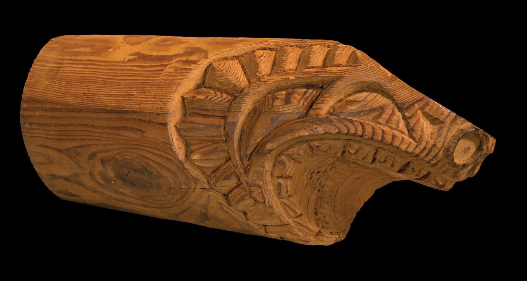 (1960s) Here is a one-off master pattern carving for a stylized Hawaiian Ku-God head, used to replicate architectural support post ends that would cantilever outwards from the roofline. A substantial carving. 8"x18.5". VG+ with typical wear.
