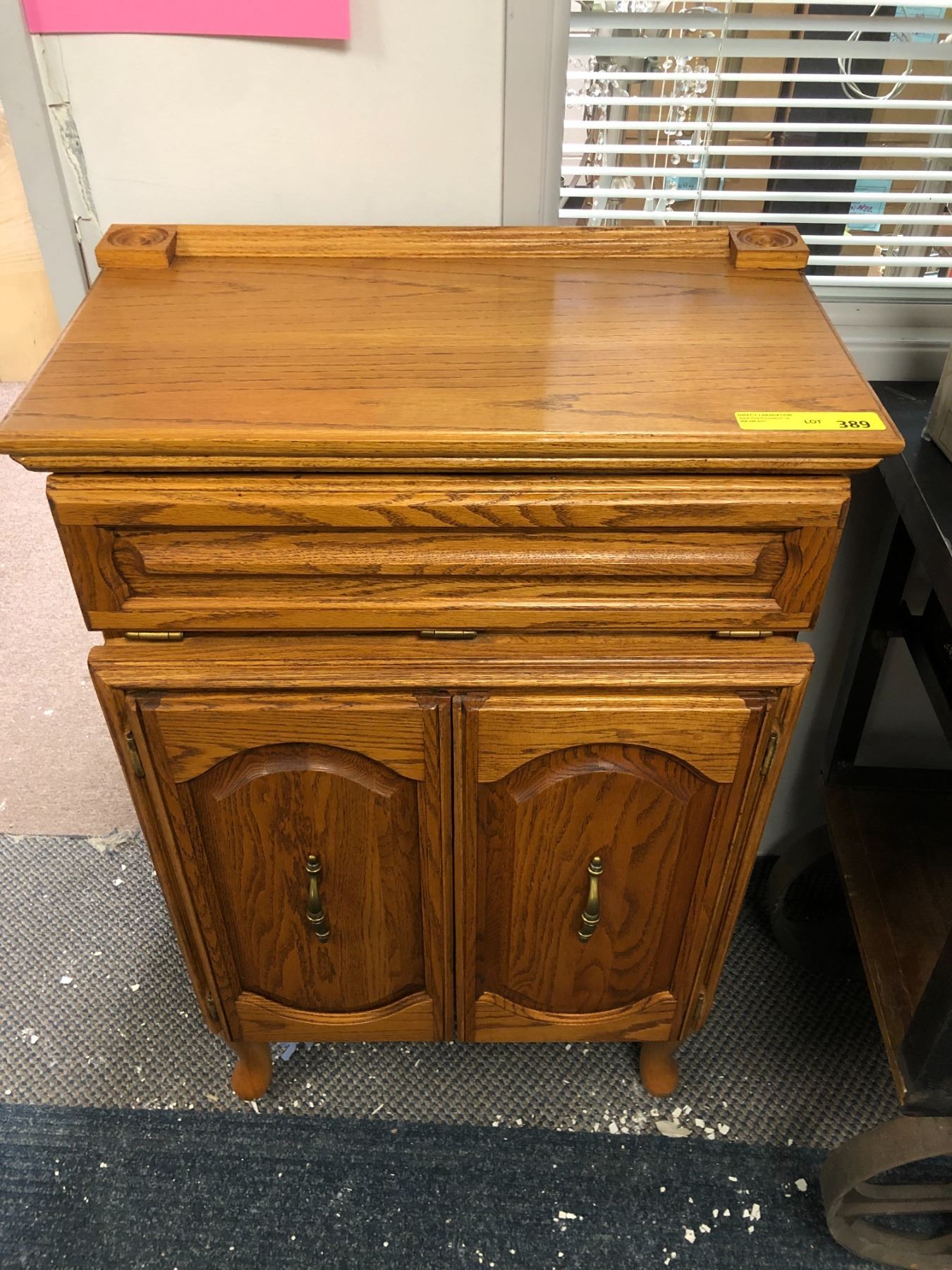 OAK Telephone Table - with desk style hinged door and cupboards below - approx. 25in x 14in x 41in