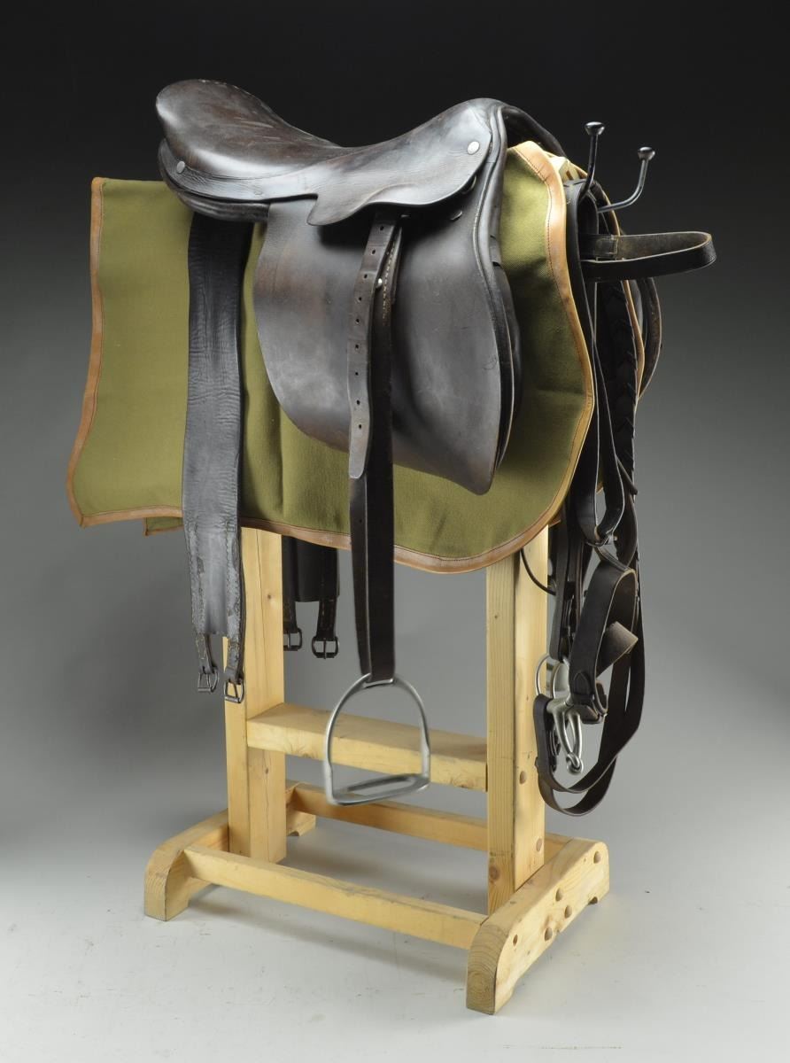 FRANCE. Made in the Model 1917 pattern & popular during WWI, this brown leather saddle appears complete w/ girth & bridle. Comes w/ repro. green canvas saddle pad. Stirrups stamped "MADE IN ENGLAND". CONDITION: good overall appearing w/ wear, flexing & patina. Stitching appears tight. Some screws appear chrome replacements. (02-16326/MD). $200-300.