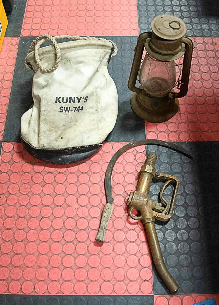 OLD ANTIQUE LANTERN/GAS HANDLEWITH BAG & SCYTHE
