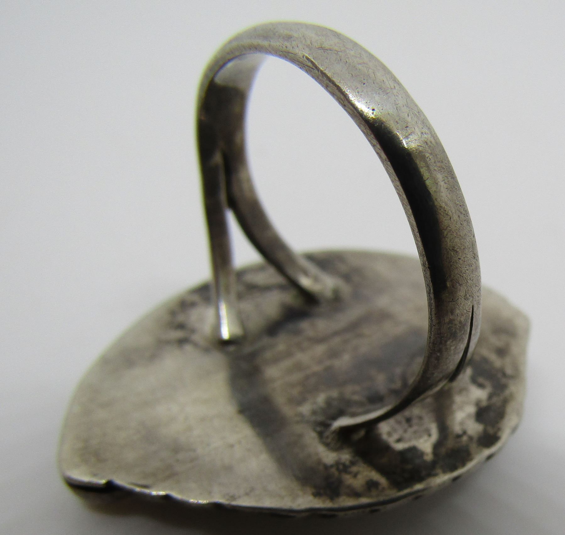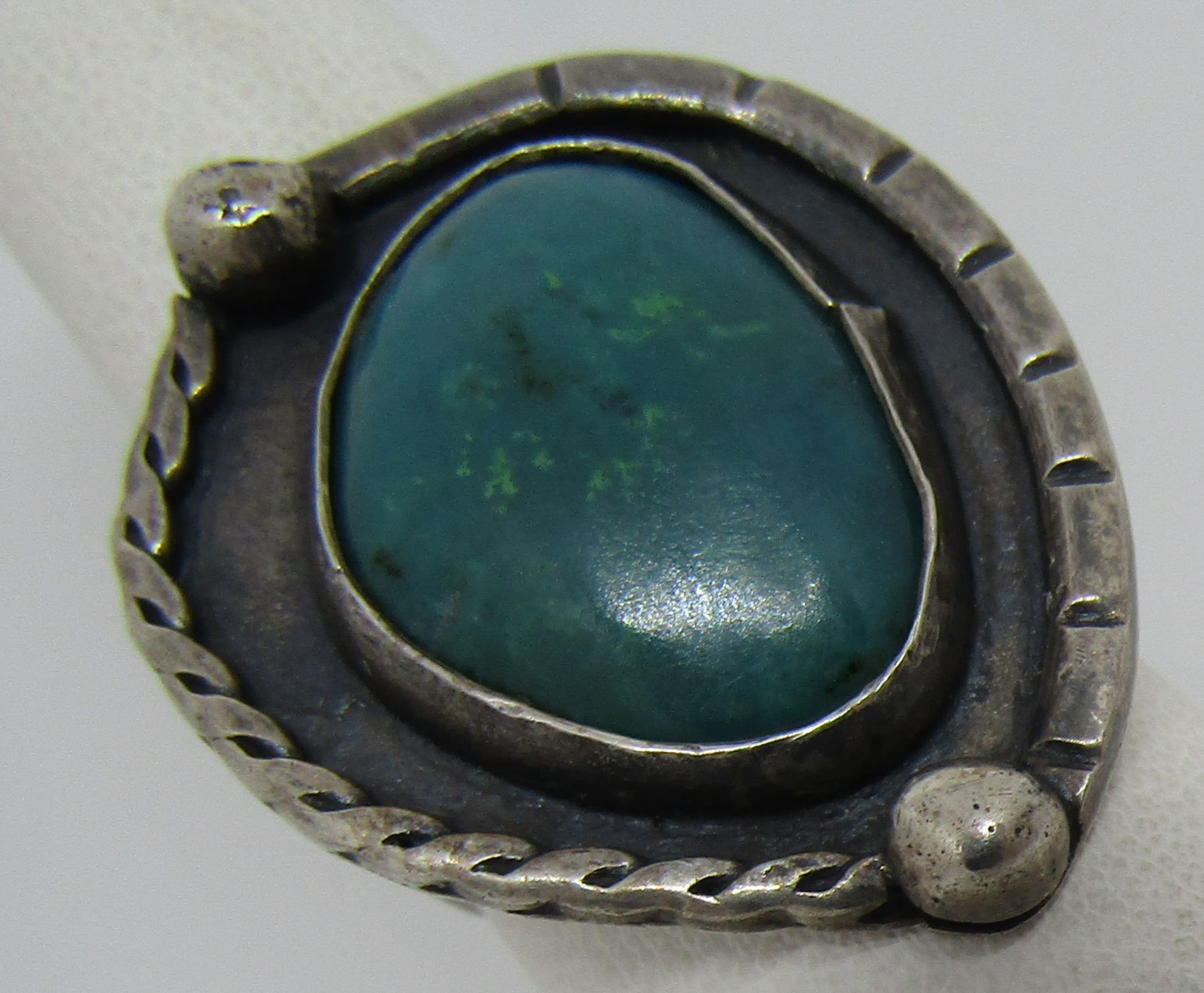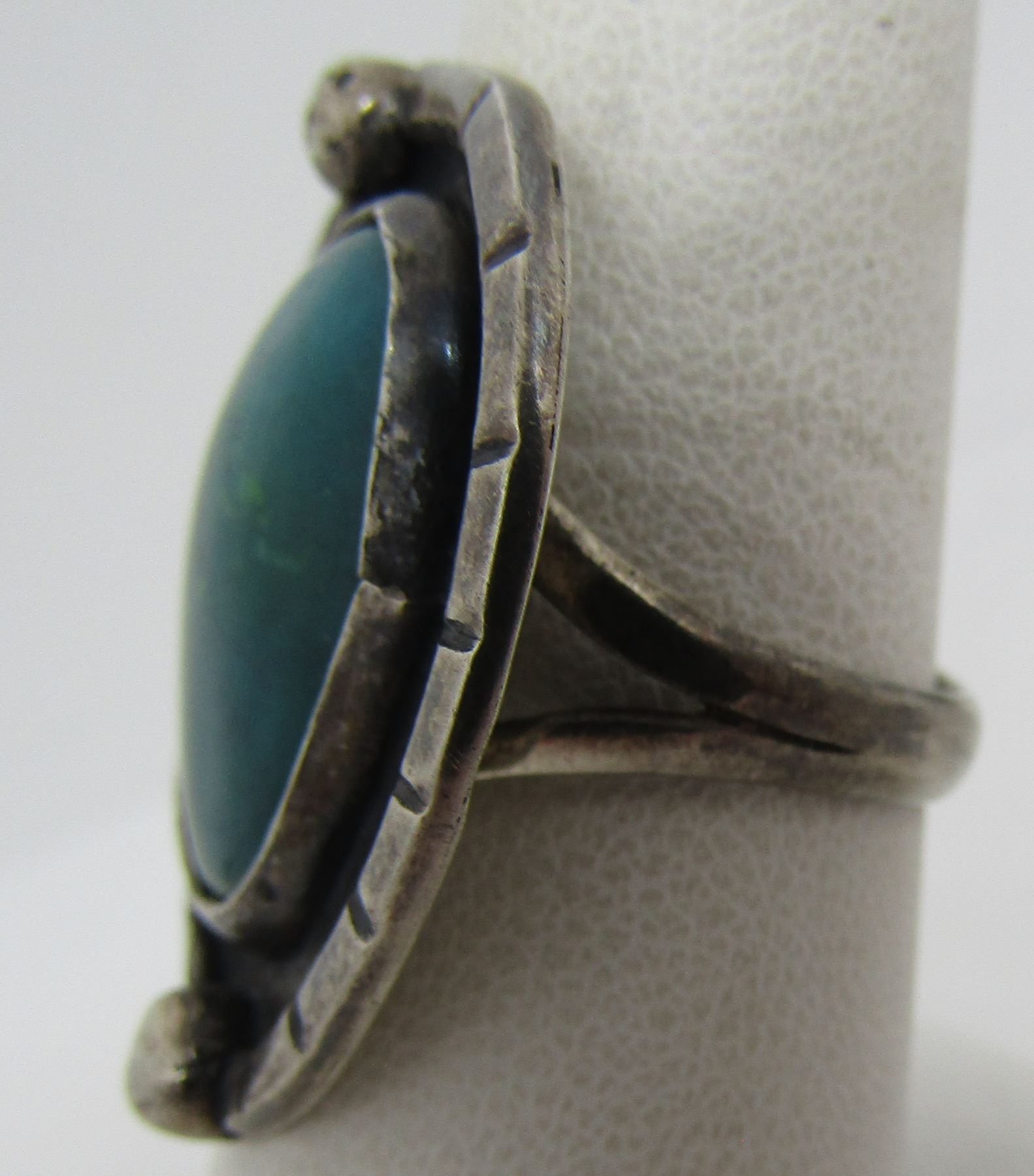 UNMARKED TESTED STERLING SILVER. VINTAGE ESTATE NATIVE AMERICAN SOUTHWEST INDIAN JEWELRY. BEZEL MOUNTED WITH 1 GREEN TURQUOISE STONE. TOP MEASURES 24MM WIDE BY 30MM LONG.. WEIGHS 7.6 GRAMS. SIZE 8.75. USA SHIPPING $5.