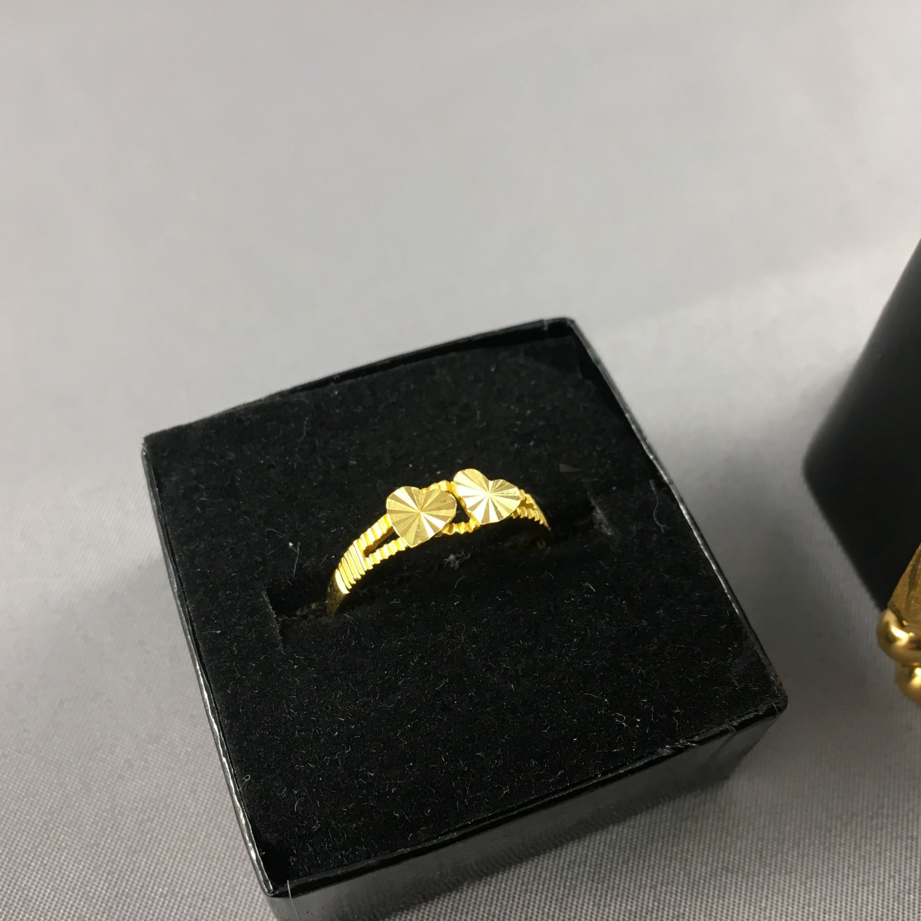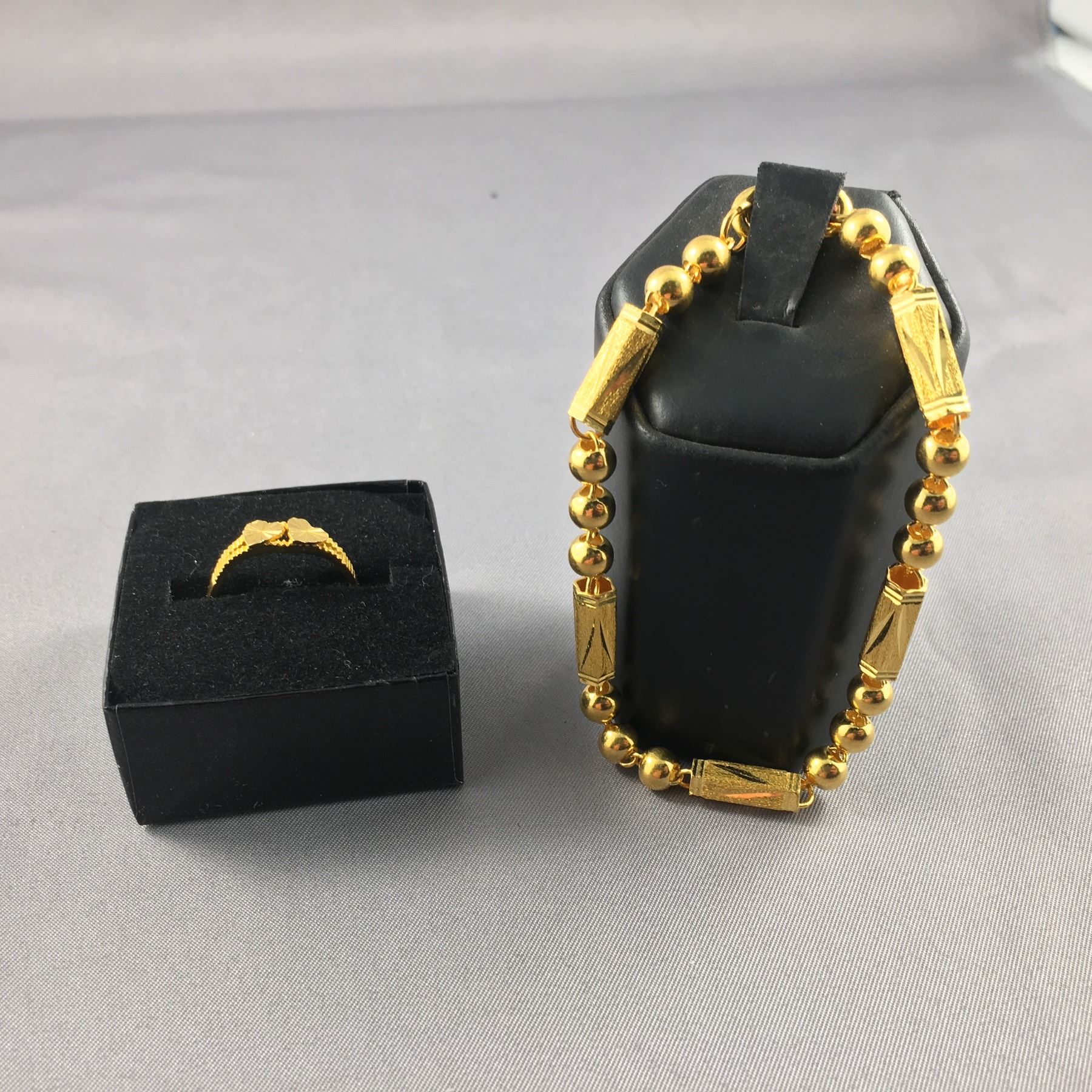 ONE 22-24KT YELLOW GOLD BALL AND BAR STYLE LINK BRACELET 19CM LONG. WHICH HAS A TEXTURED FINISH AND BRIGHT CUT STAR DESIGN. REPLACEMENT VALUE: #$1900.00. ONE LADIES 22-24KT YELLOW GOLD DRESS RING 3.85MM. WIDE WEIGHT IS 3.40 GRAMS. REPLACEMENT VALUE: $425.00