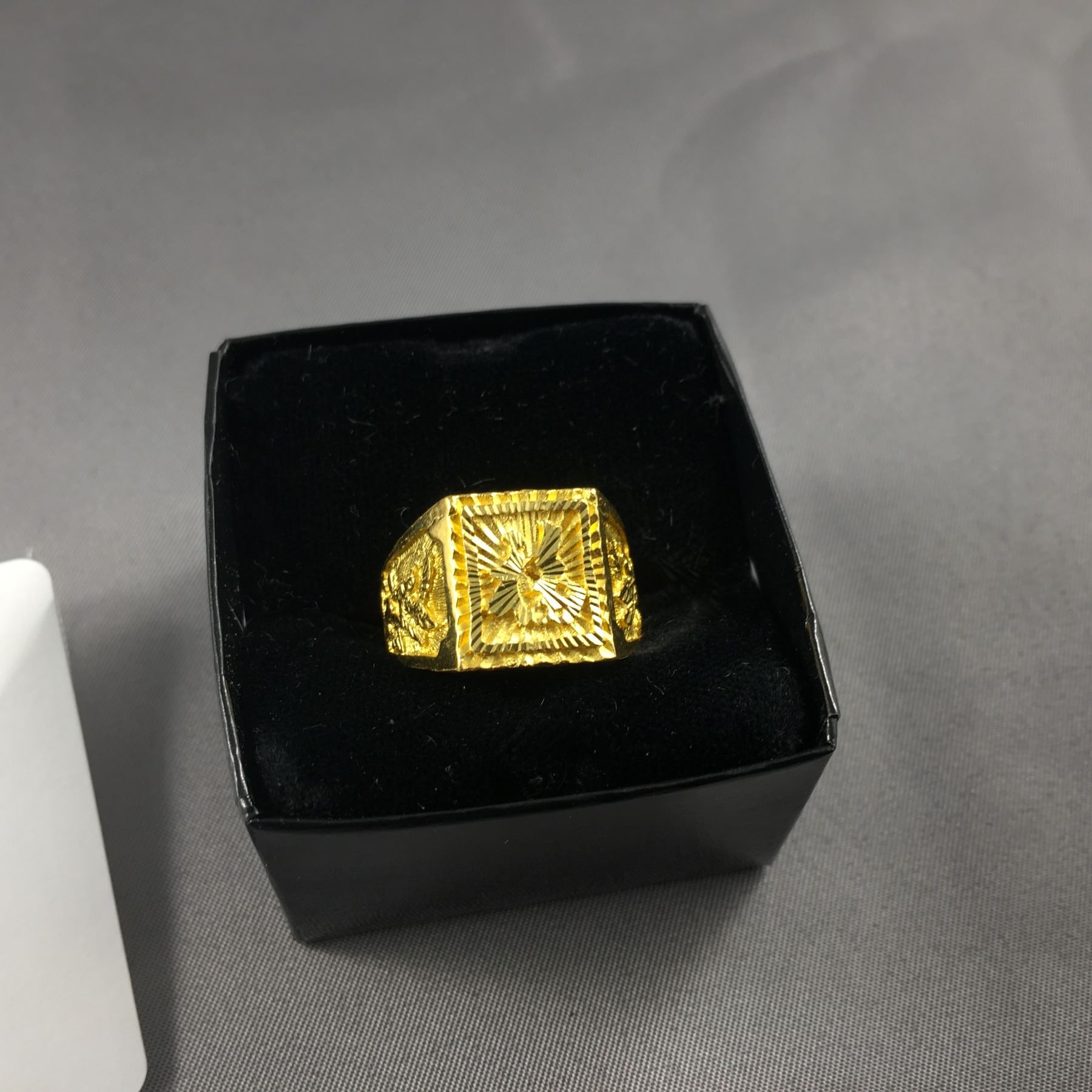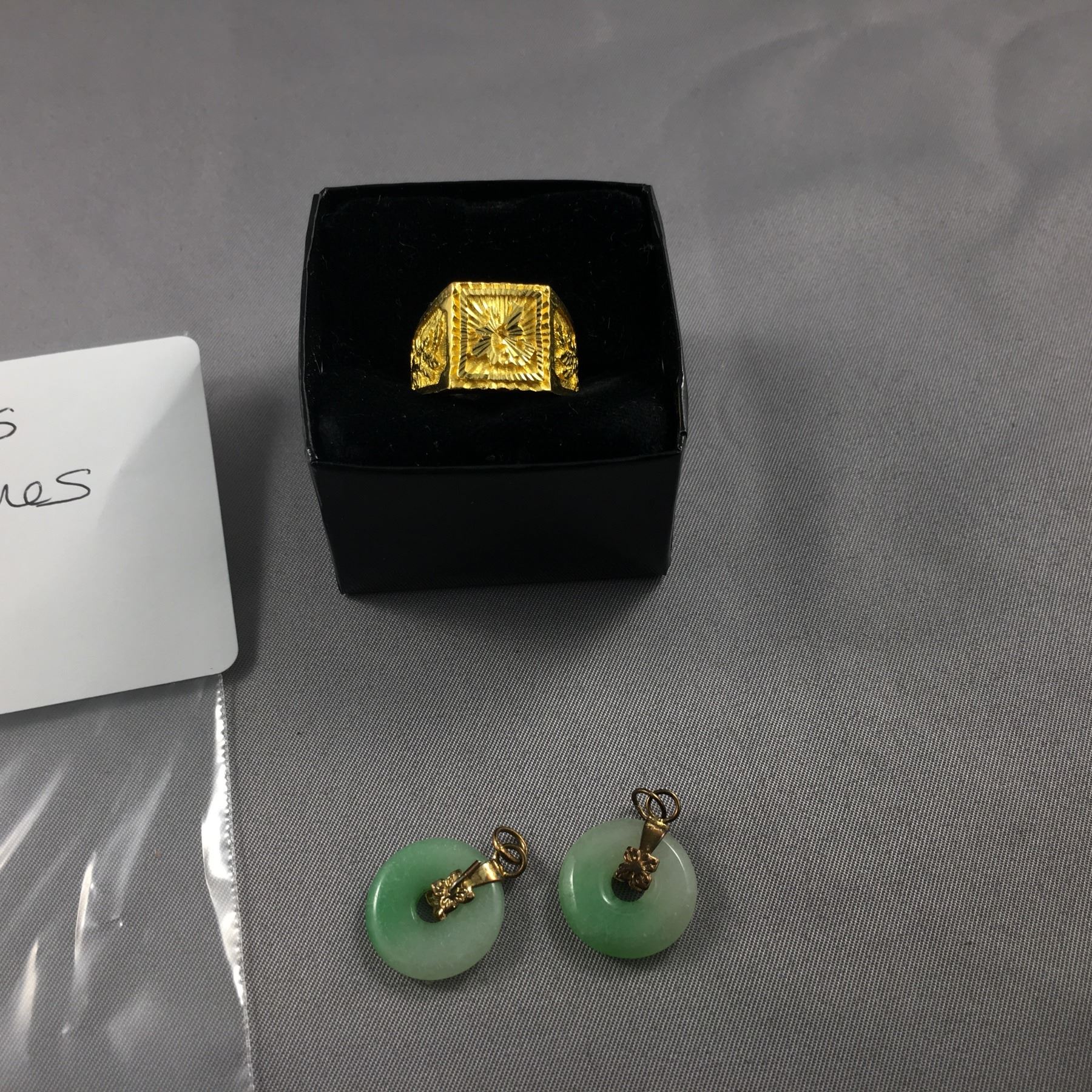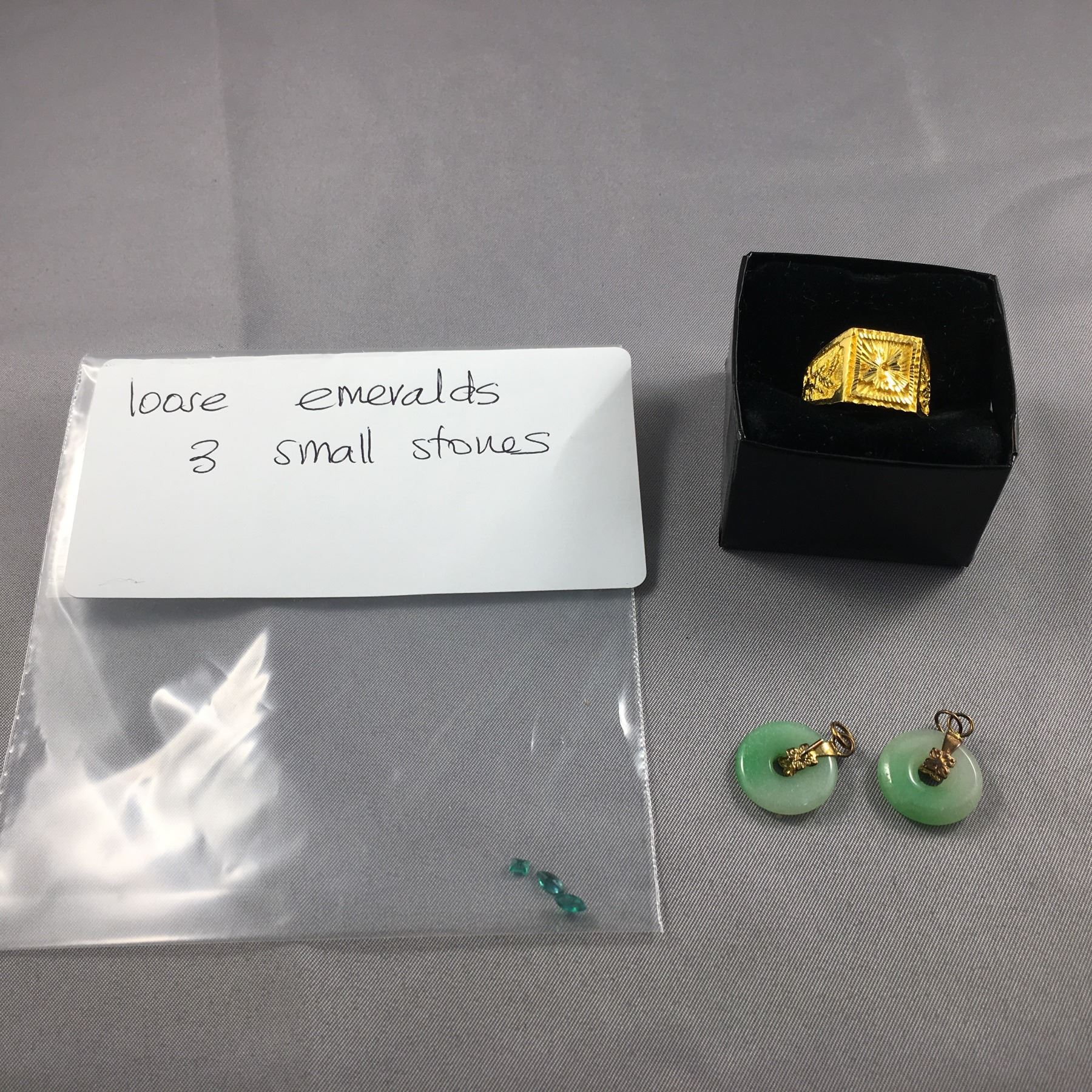 ONE 22-24KT YELLOW GOLD GENTS DRESS RING WITH DIAMOND CUT DESIGN WITH A PHOENIX DESIGN WEIGHS 13.90GRAMS REPLACEMENT VALUE: $1700.00. 2 JADE HOLOLITH PENDANTS WITH YELLOW GOLD PLATED CENTERS & JUMPRINGS WEIGHT 2.90 GRAMS. TWO LOOSE MARQUISE SHAPED NATURAL EMERALDS & 1 LOOSE STEP CUT NATURAL EMERALD TOTAL WEIGHT 0.39 CARATS. TOTAL REPLACEMENT VALUE: $300.00