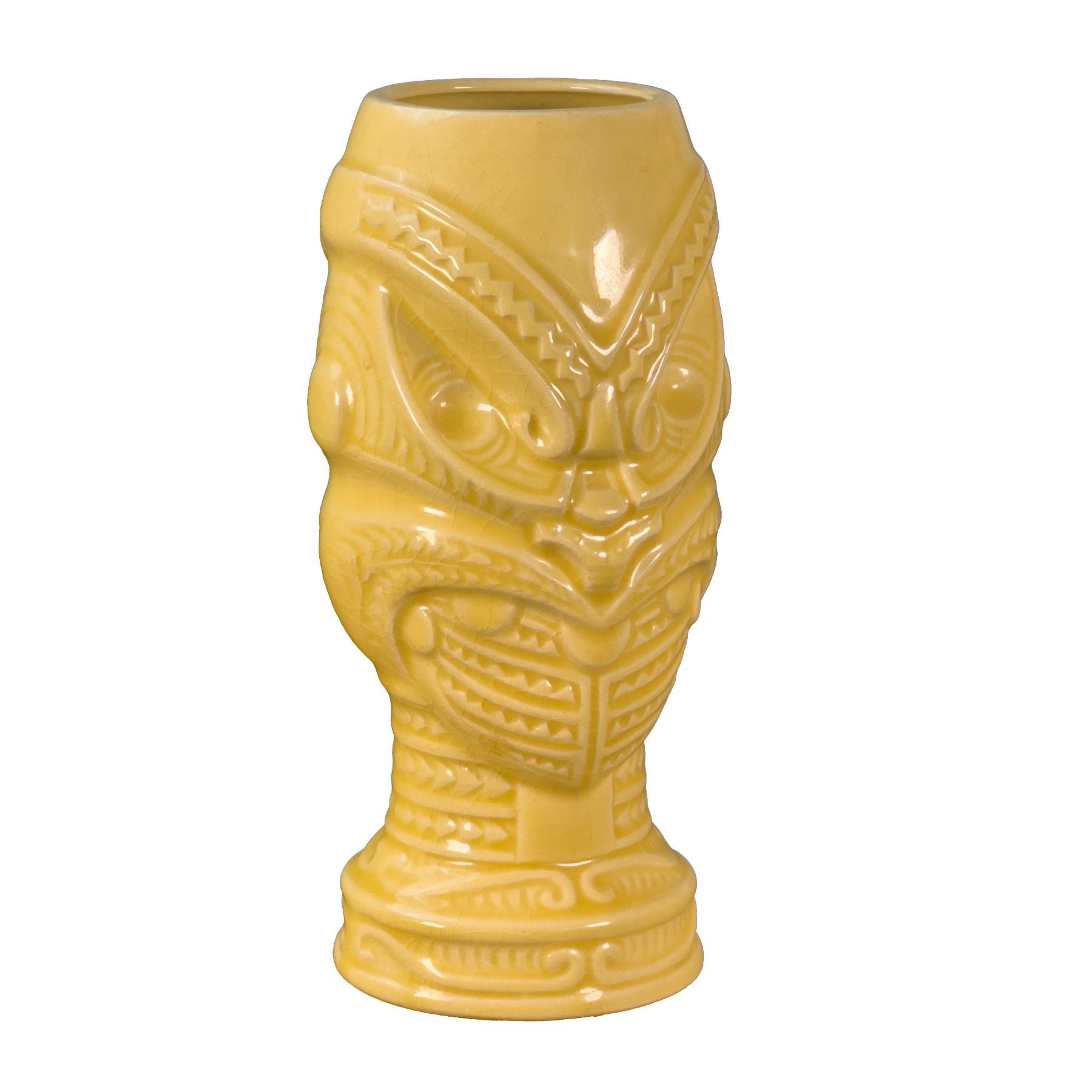 (1960s) Handsome Tiki mug from Orchids of Hawaii. These were also available in brown and green. Features the detailed sculpt of Maori tattoo. 7.75"x4". VG+ with light crazing in the glaze with age.