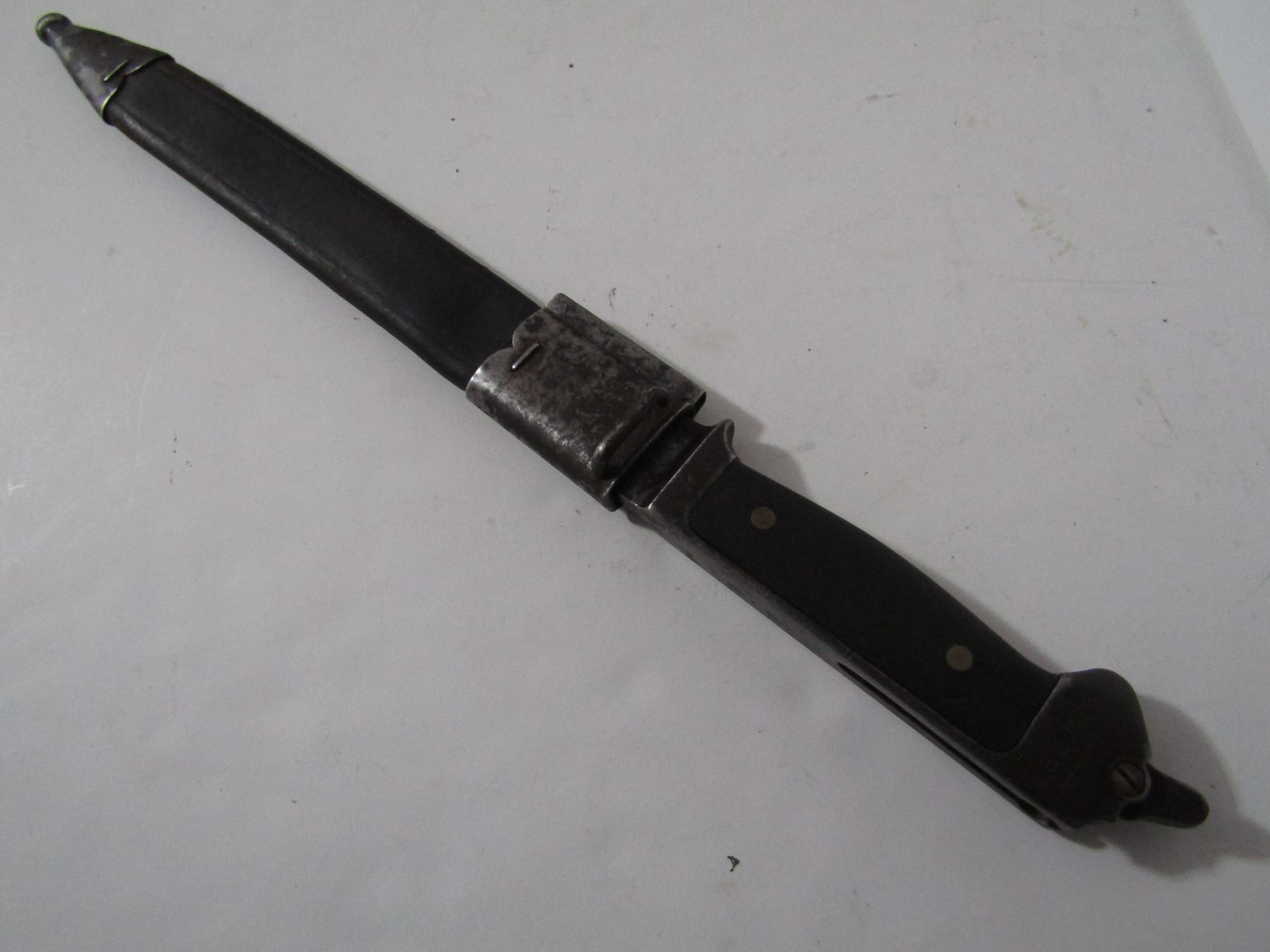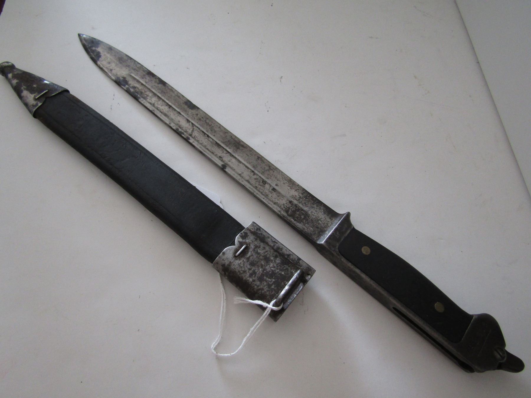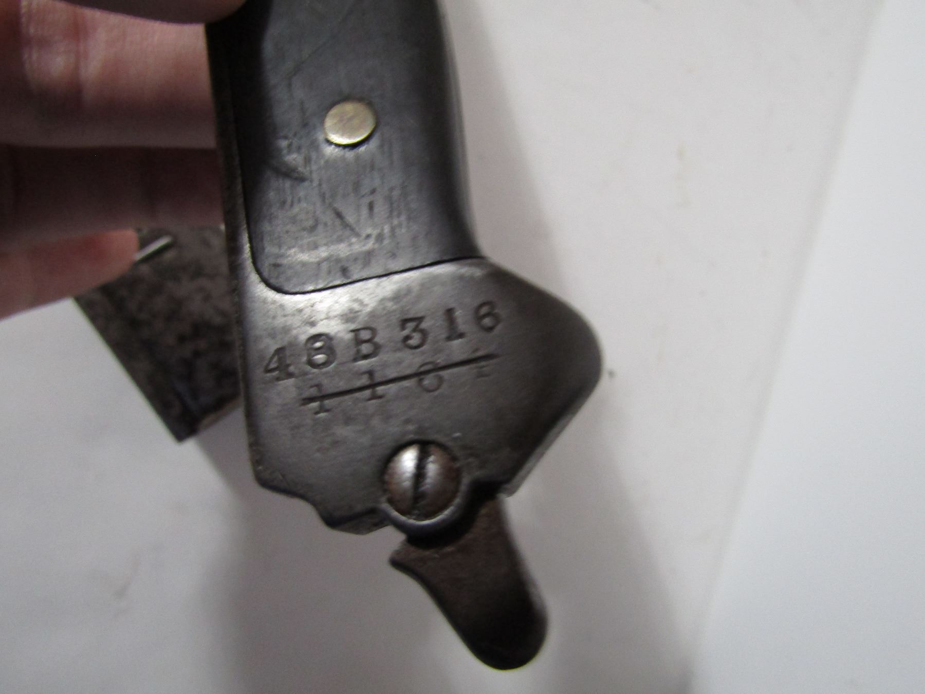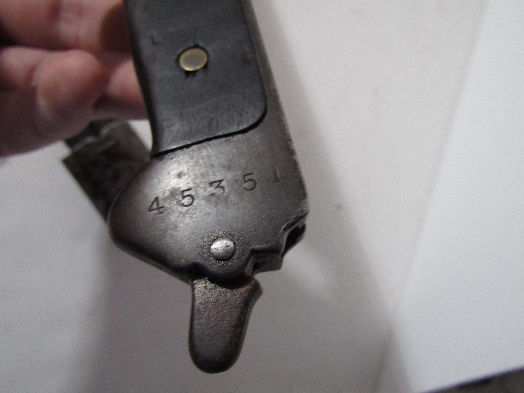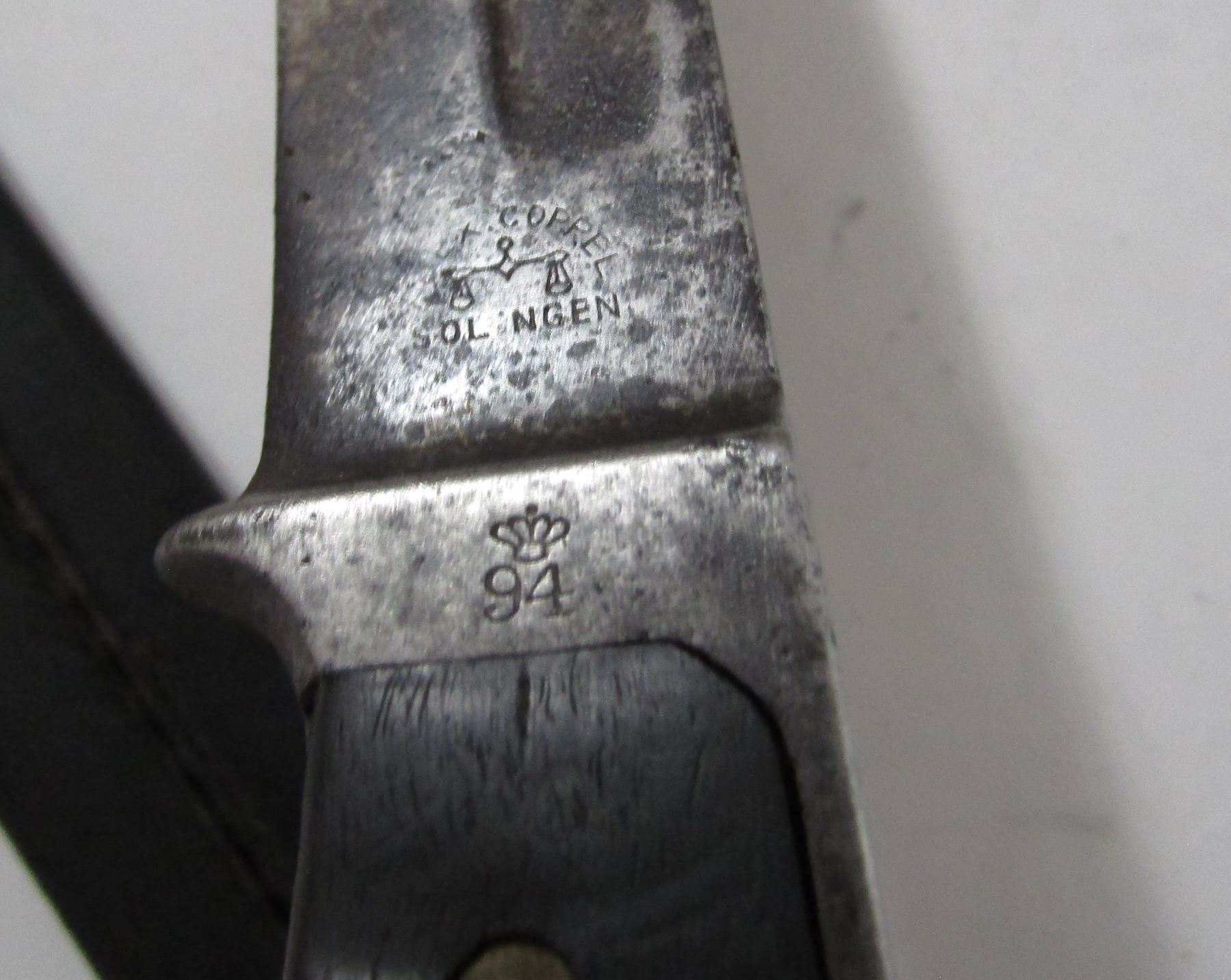 ORIGINAL PERIOD PIECE FROM THE 1910S WORLD WAR I RIFLE BAYONET. UNIQUE MARKINGS IT HAS AN EARLY SERIAL NUMBER SLASHED OUT (1164) TO 48B316 AND SHEATH PARTIALLY MATCHES 48B361 POSSIBLE ERROR. ALSO MARKED 45351 ALEX COPPEL SOLINGEN 94. MEASURES 13.5" TOTAL. HAS WEAR, PLEASE VIEW PHOTOS FOR CONDITION. USA SHIPPING $10.