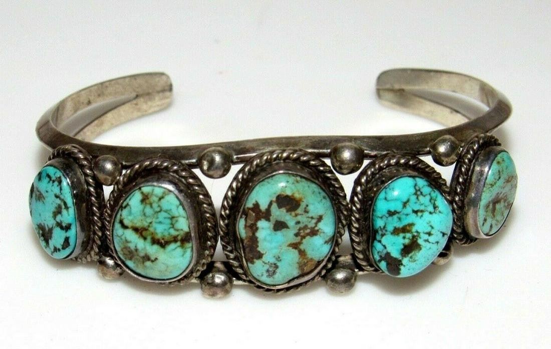 For your consideration is this stunningl example of vintage Native American art. This fab bracelet features a beautiful hand etched traditional design in sterling silver accented with amazing turquoise cabochons from the southwestern mines. The cuff is unmarked as most vintage Native American pieces from the time period and has been tested for silver content. The bracelet is little over 1/2" wide at the widest point and the inside circumference is about 6 3/4" including gap. The gap is about 1 1/2". The cuff can be slightly carefully adjusted. Stunning example of wearable Native American art to add to any collection!
