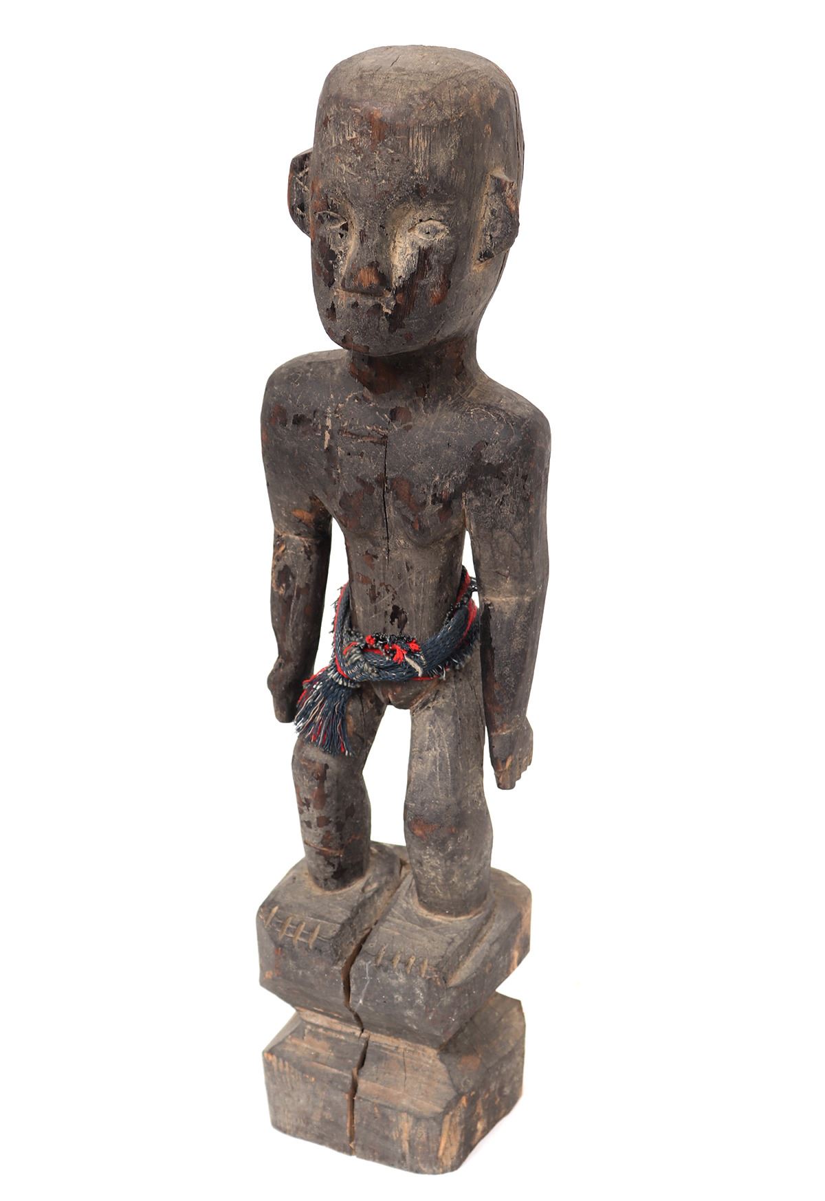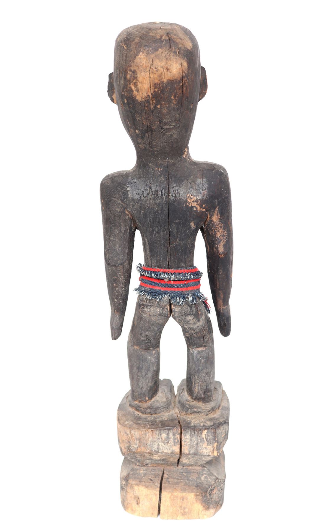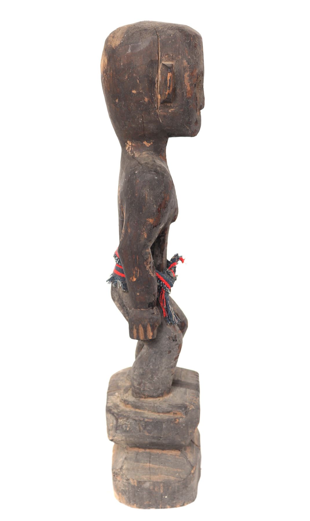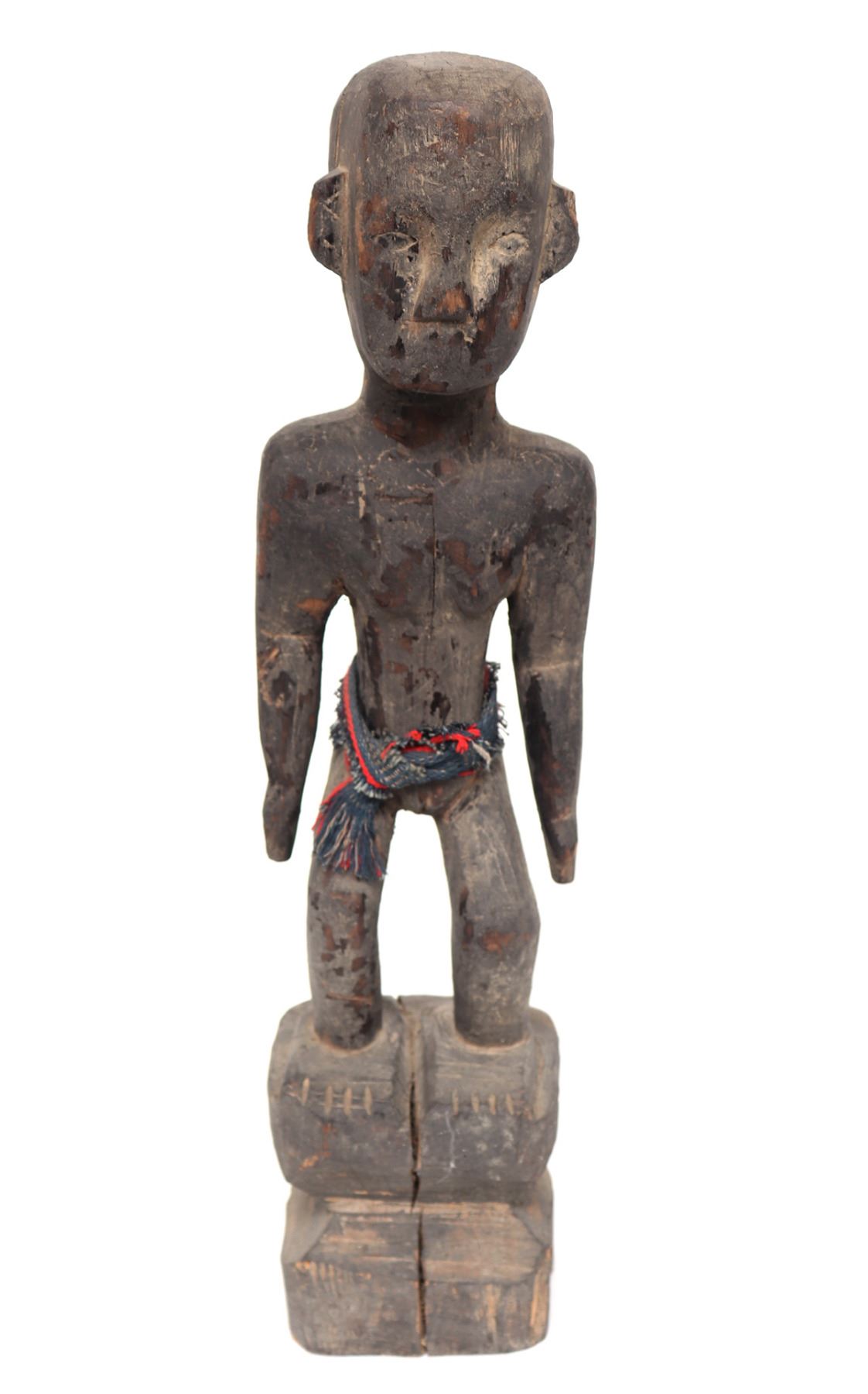 Early Ifugao wood carved standing Filipino Rice God with textile belt in blue red and white. Broad shouldered figure, standing in a slight squat position with arms at his side. Almond slit eyes, rectangular protruding nose, small protruding ears. Carved from a single piece of wood including an accordion squared base. Inventory sticker on the base purports the piece to be Poitan Bulul. Size 22 3/4" H, 6" W. Condition: Wear throughout with surface scratched and split to wood, patina throughout commensurate with age.