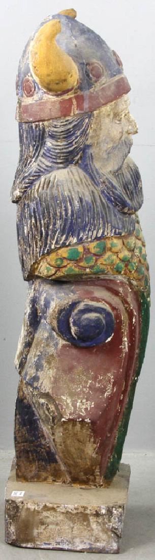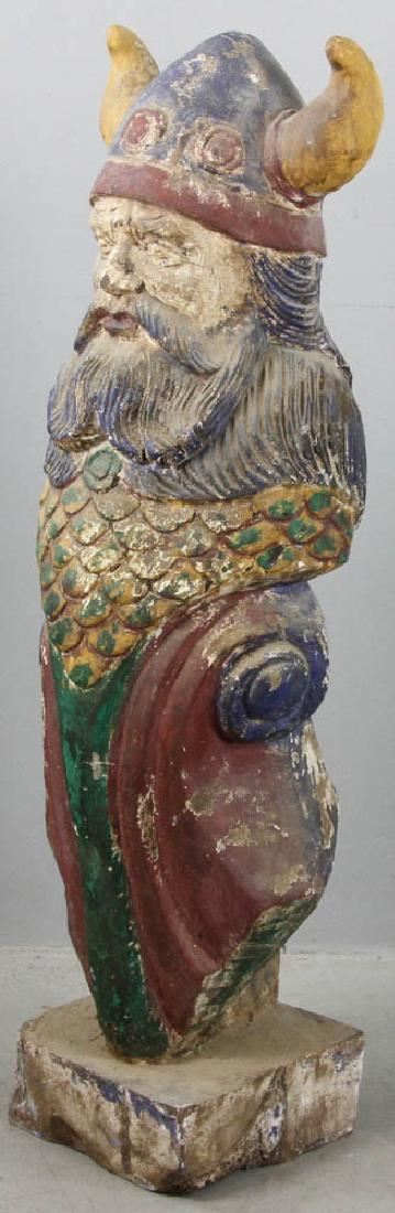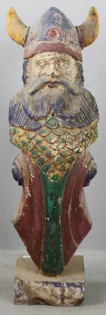 Old wood carving of a Viking, 43" H x 14" W x 11" D. Provenance: Wakefield, Massachusetts estate.