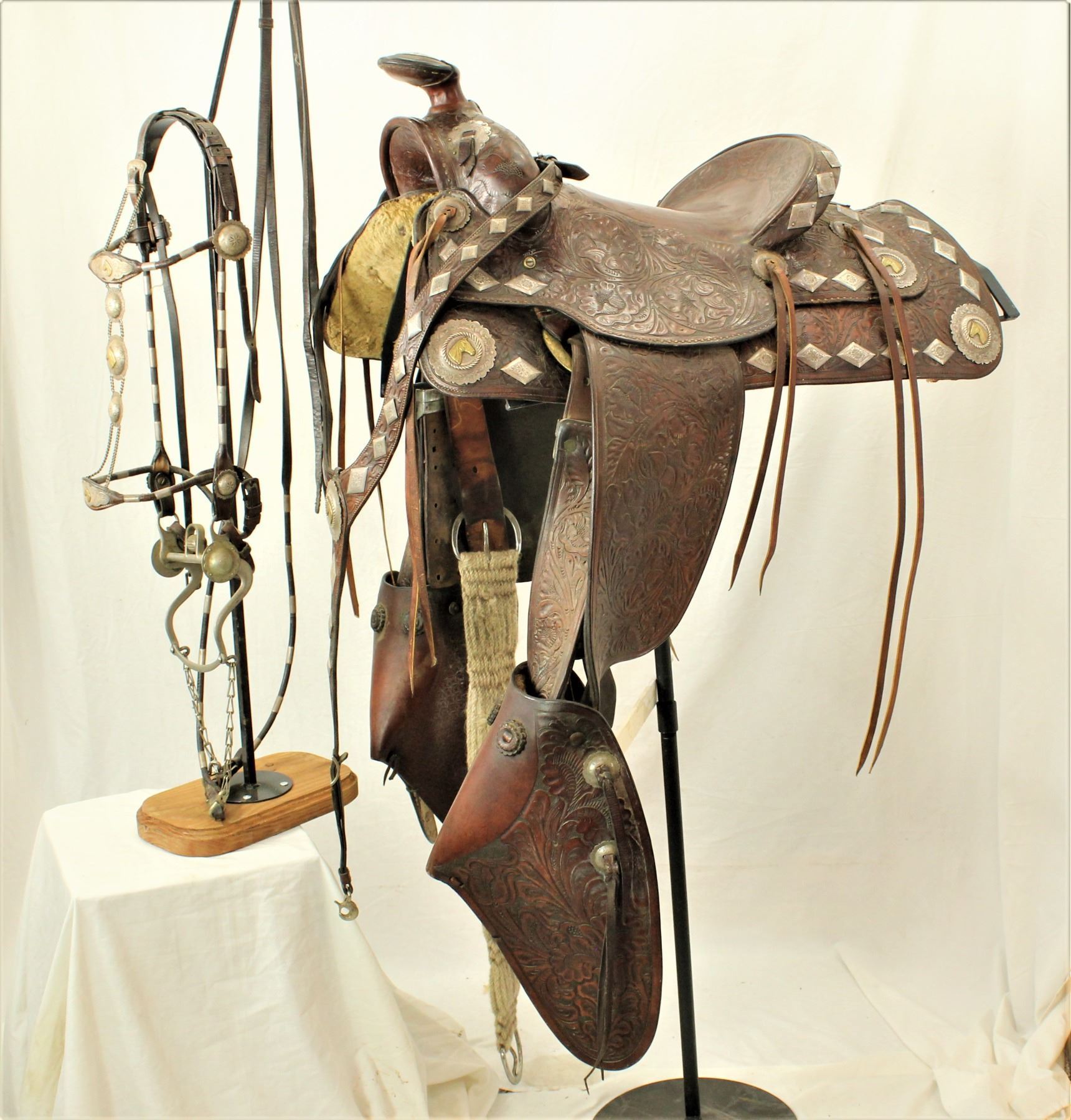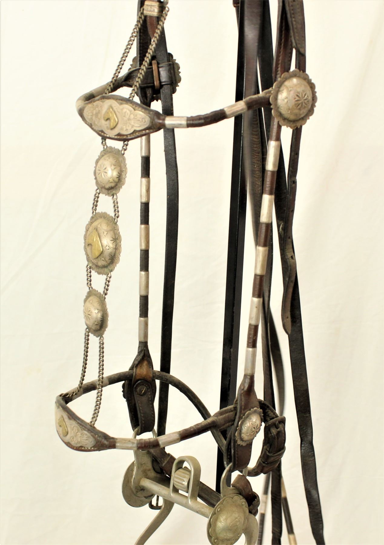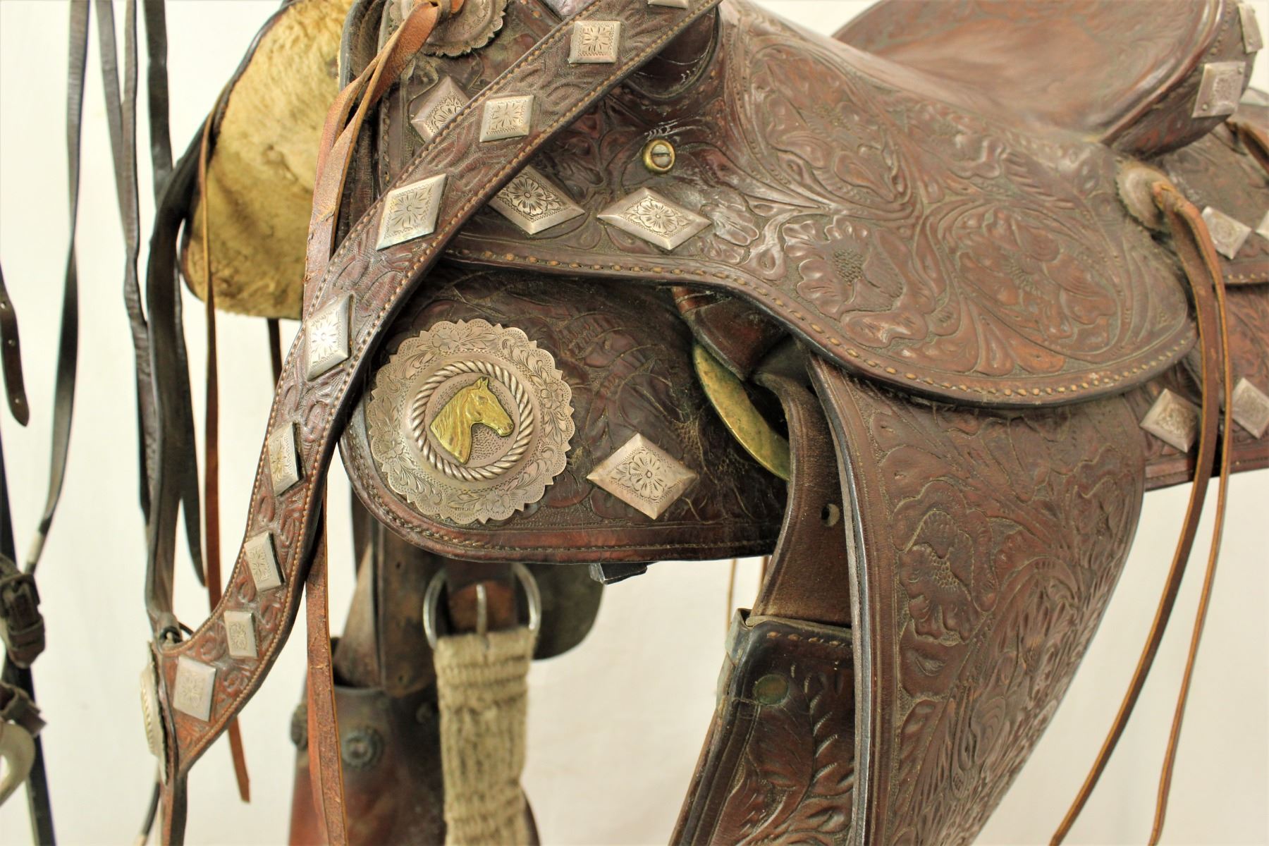 Nicely presenting unmarked silver mounted saddle with its matching martingale and bridle. In very uncommon brown color, this saddle with 16" seat is adorned with silver that we attribute to Olsen Nolte, with scalloped silver medallions with horseheads and diamond perimeter, along with 18" tapaderos, and a fabulous bridle with elaborate face chain.