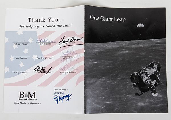 "One Giant Leap" 3rd Salute To Astronaut Honorees � 1996 Program � Autographed By Shepard, Lovell, Borman, Guy Bluford A. "The Museum of Flying Airventure" honored these five astronauts plus 4 others. The program features a page highlighting the accomplishments of each honoree as well as congratulatory letters from John Glenn, Governor Wilson, Al Gore and others. Bluford was the first African American to fly in space (STS-8) and Sullivan was the first American woman to walk in space. Ex. the Michael Orenstein Estate Collection.