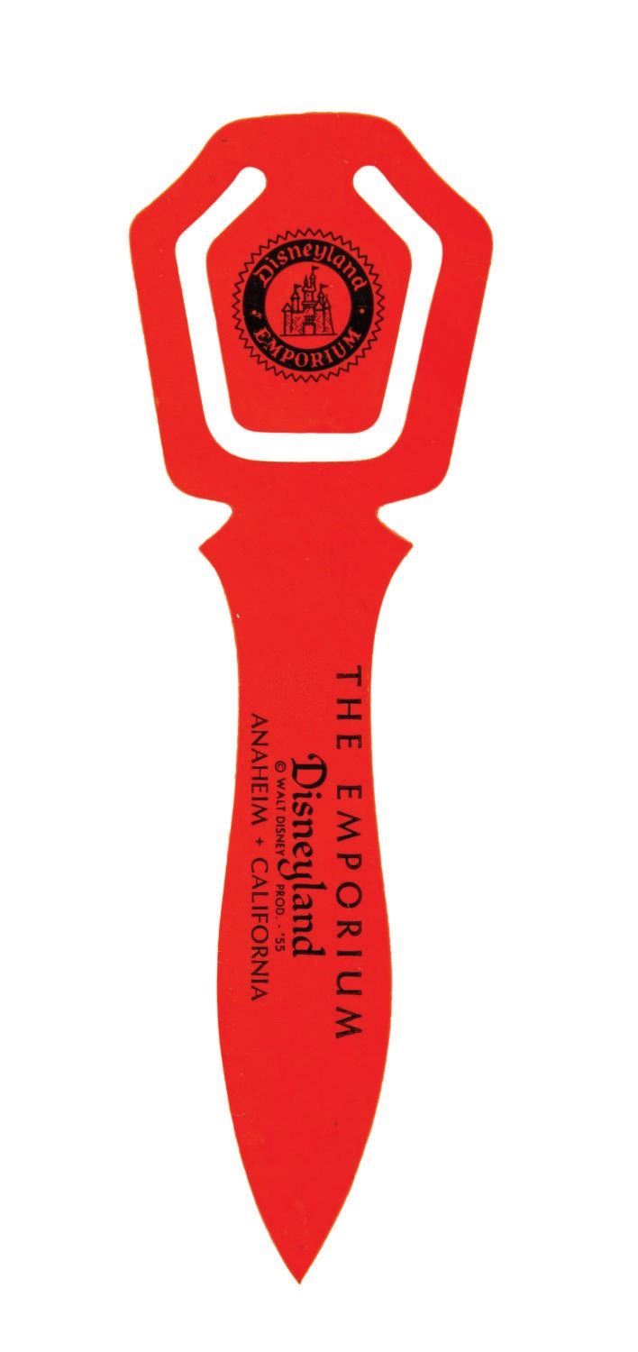 (Disneyland, 1955) A rare opening year Disneyland Emporium bookmark. Few of these opening year souvenirs survived, bearing the emblematic seal of the Disneyland Emporium of Orange County. Measuring 4.75"x1.5", the orange plastic souvenir bookmark is in fine condition.