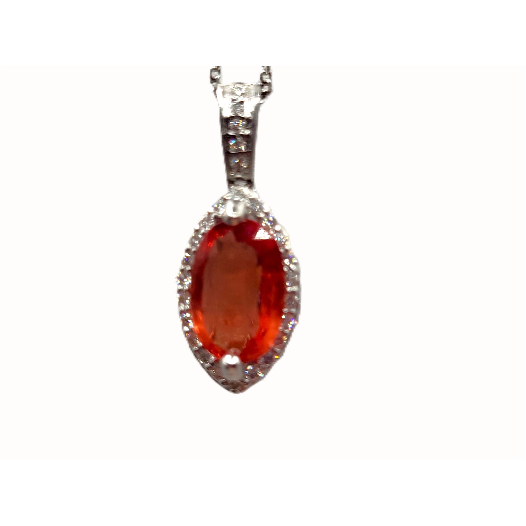 A 1.39 carat oval-cut, genuine orange sapphire is prong-set in a navette-shaped 14 karat white god pendant with .15 carats total weight round, brilliant-cut, I color, I1-I2 clarity diamonds in the floating halo and bail. The pendant has a ribbed back gallery for better balance and hangs from an 18& quot; fine link chain with spring ring. Admin: e7159/6-nhg