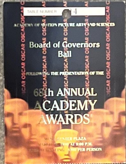 Original 1996 Admission Ticket to 68th Annual Academy Awards on March 25, 1996 This item is part of an exclusive collection obtained from an executive at Paramount Pictures.