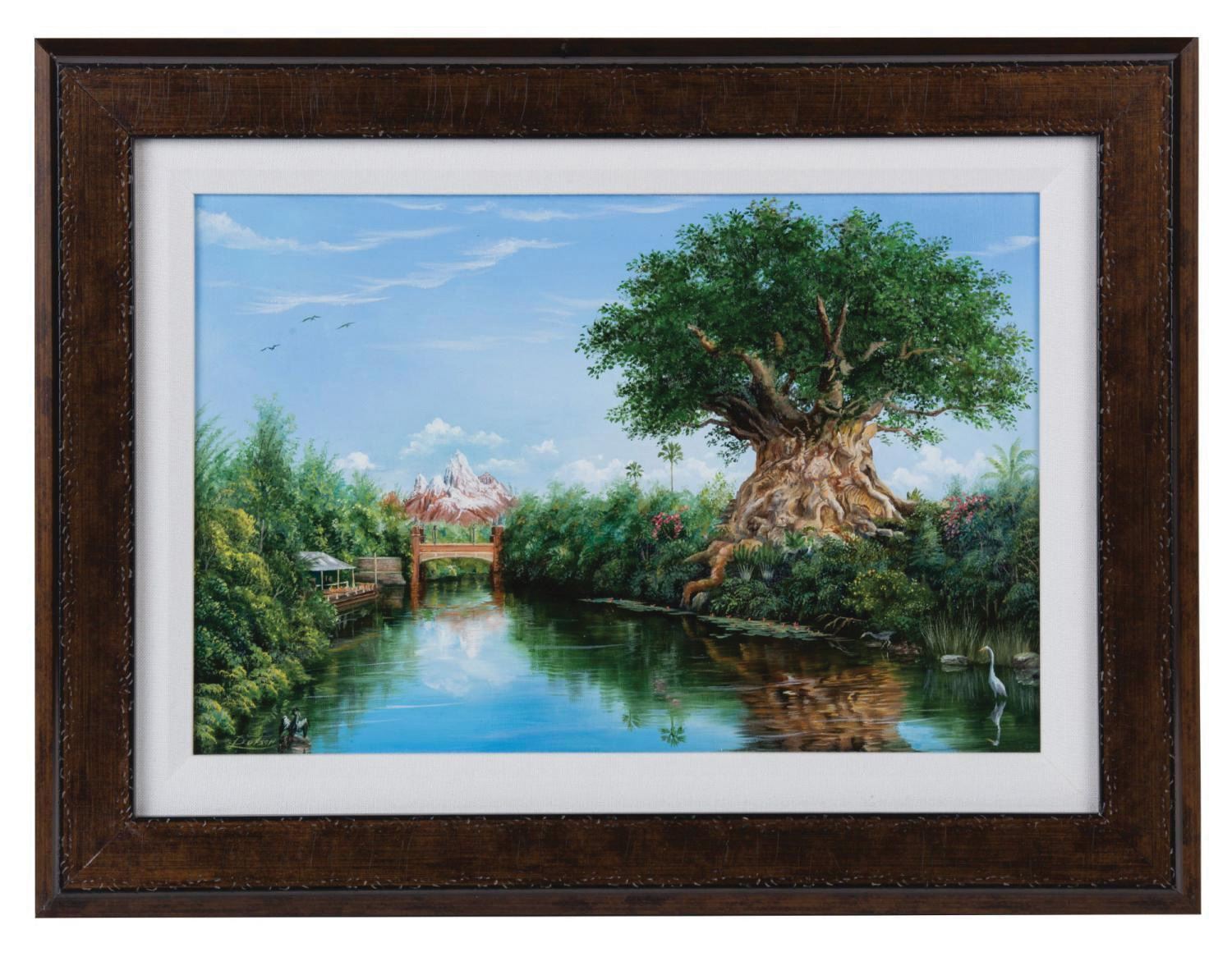 (Animal Kingdom, 2003) A one of a kind original oil painting by Larry Dotson titled "Disney's Animal Kingdom from Harambe Village." Dotson is a renowned landscape artist, whose work has been regularly featured in galleries and resorts across numerous Disney properties for over 20 years. The piece offers a scenic and naturally lush interpretation of one's perspective from Africa in Disney's Animal Kingdom. Two of the park's cornerstone attractions are depicted from this view, with a richly detailed Tree of Life prominently featured, and the snow-capped peaks of Expedition Everest emerging from the treetops on the horizon. This original artwork so perfectly captured the essence of Animal Kingdom that it had also been used to create a series of popular limited edition prints. The painting has a viewable image size of 10.5"x15.5" with the canvas having been professionally matted and framed to a size of 16"x21". The piece features Dotson's signature in the bottom-left, as well as a hand-written title and signature on the reverse. The painting is in very fine condition, and ready to be displayed. Accompanied with a Certificate of Authenticity from Larry Dotson Studio.