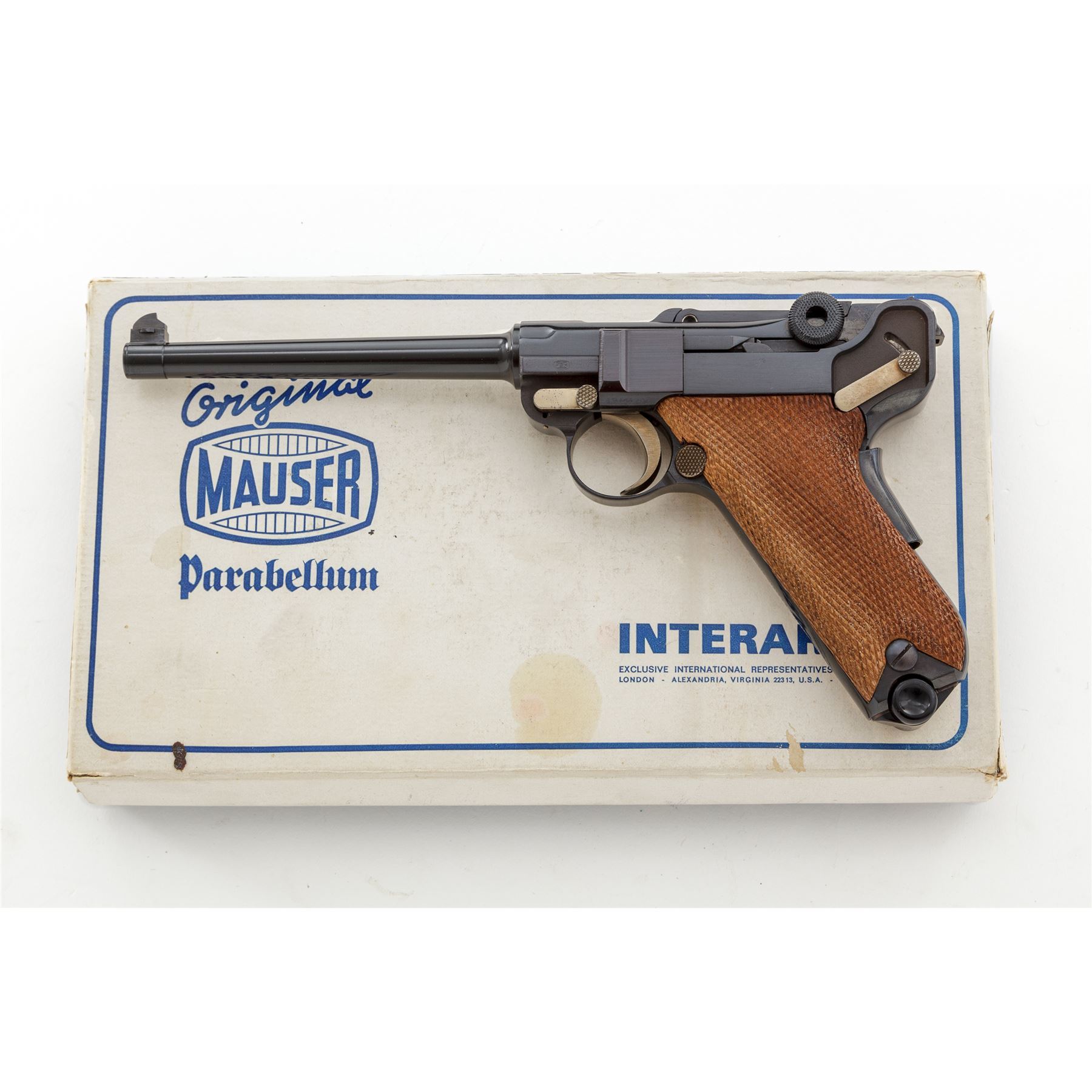 Like New Boxed Original Mauser/Interarms American Eagle Luger, #10.003989, .30 Luger cal., 6'' barrel, high polish blue finish, straw colored small parts, checkered wood grips, standard fixed sights, with two (2) factory magazines. In original box with cleaning rod, blue plastic Mauser hang tag, takedown tool, original test target and owner's manual. Top of frame marked with an American Eagle; front gripstrap marked ''Mauser-Werke A.G. Oberndorf a.N.'' Toggle marked ''Original/(Mauser Banner)''; right side marked ''Interarms, Alexandria, Virginia''; back marked ''Made in Germany''. Condition overall is excellent, appearing as new, with only a few slight handling marks. Grips with clean, sharp checkering. All factory marks are clear and defined. Straw-colored small parts of the left side with a little very minor dark speckling. Action is tight, bore is mirror bright. Extra magazine with a few spots of light surface rust on the follower. Pistol appears to have seen very little, if any, use. Box with some moderate staining and storage type wear; lid is separated at corners but intact. Est.: $1,000-$1,500. (C&R/PPT)