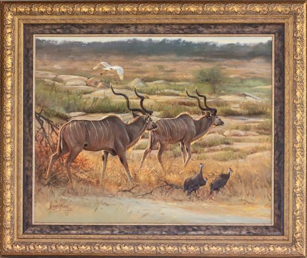 Call Of Africa Galleries has donated an Original Oil on Canvas featuring two kudu and birds on plane titled 'Direction Thirst' by acclaimed wildlife artist Lute Vink. With a deep understanding and respect for wildlife and nature, Lute Vink's favorite pastime is visiting game parks, where he not only gets his reference material, but also where he finds his inspiration. With a detailed colour palette and careful, considerate attention to lighting, his masterful brushstroke brings a fresh, personal and contemporary approach to his magnificent and highly desirable artwork. Comes with 41-in. by 49-in custom frame. For more information, contact Ross Parker at (954) 445-8252 and visit www.callofafrica.com.
