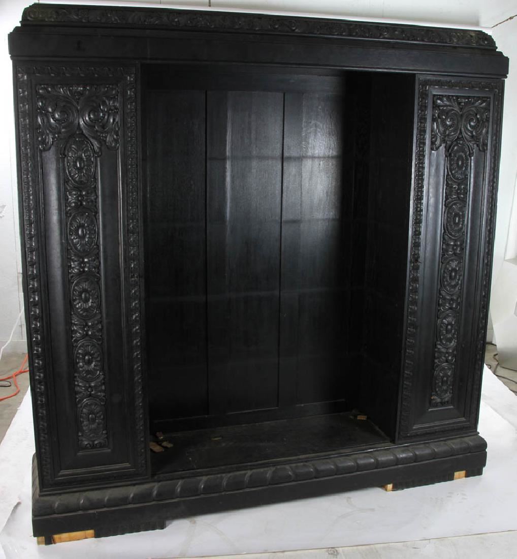 Ornately carved two-door bookcase. Doors open to reveal marble interior on one side and shelves opposite, with keys, 73" H x 72" W x 15 3/8" D. Provenance: West Palm Beach, Florida estate.
