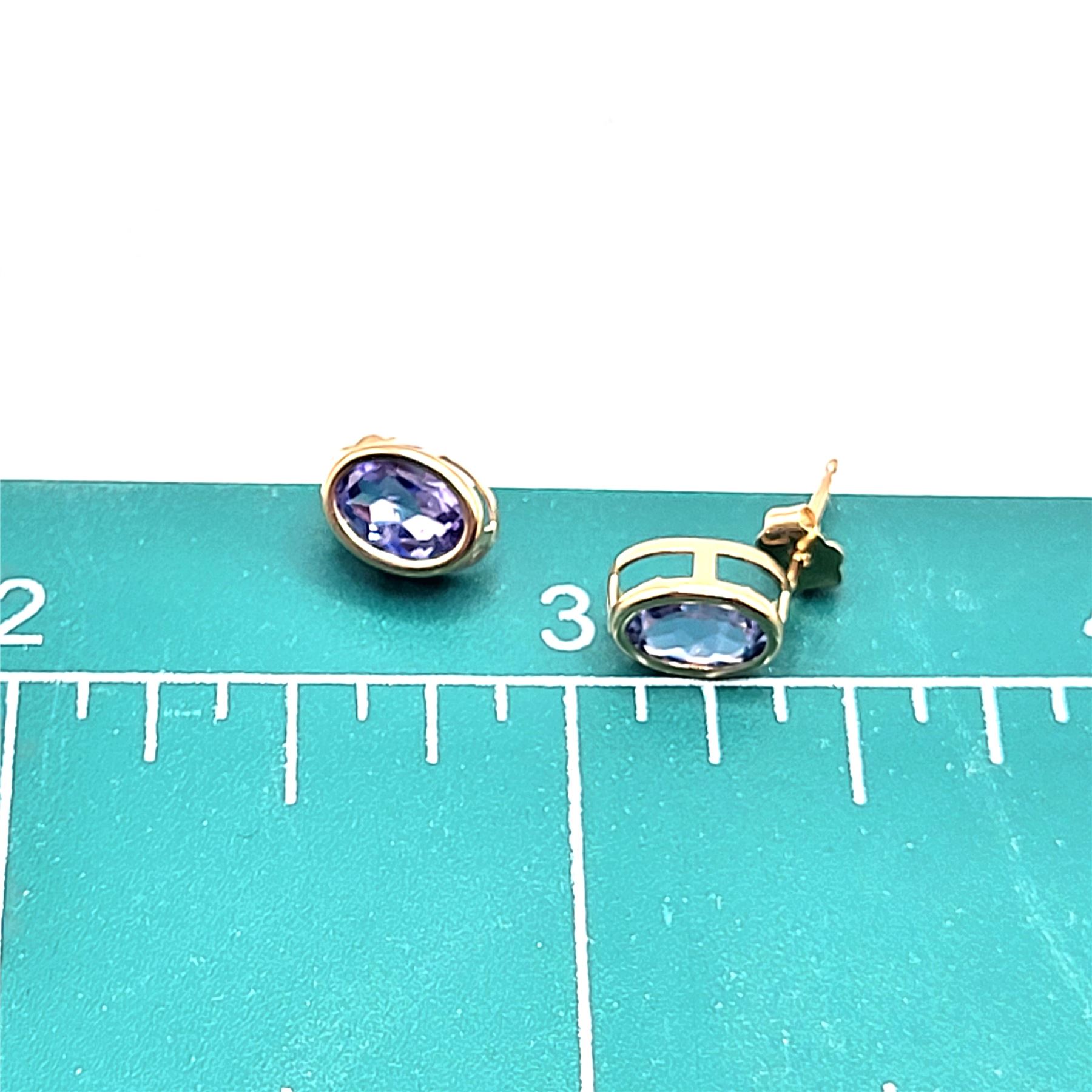 This is a pair of 14 karat yellow gold earrings that feature 1.60 carats total weight of oval-cut, bezel-set, genuine tanzanites. The tanzanites are approximately 6x4mm. The earrings attach to the earlobe with posts and friction backs.& nbsp; Admin: G11241/30ltt