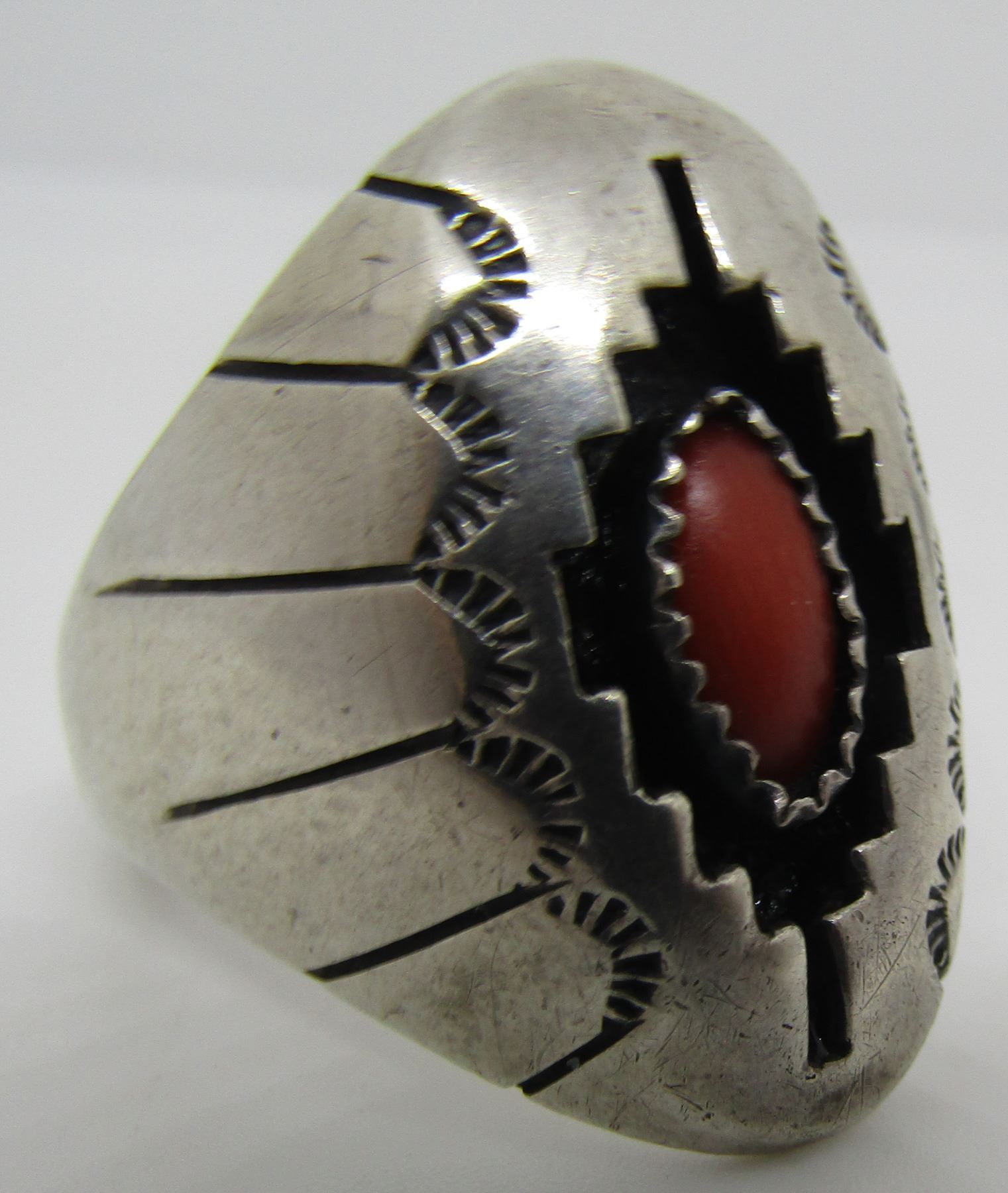 HALLMARKED "P STERLING". VINTAGE ESTATE NATIVE AMERICAN SOUTHWEST NAVAJO INDIAN JEWELRY. BEZEL MOUNTED WITH RED CORAL. TOP MEASURES 27MM WIDE. WEIGHS 14.1 GRAMS. SIZE 11. USA SHIPPING $5.