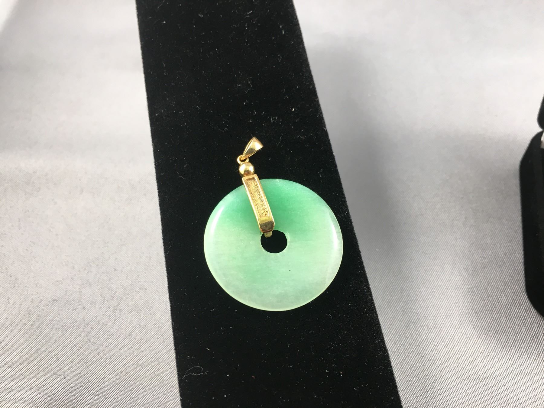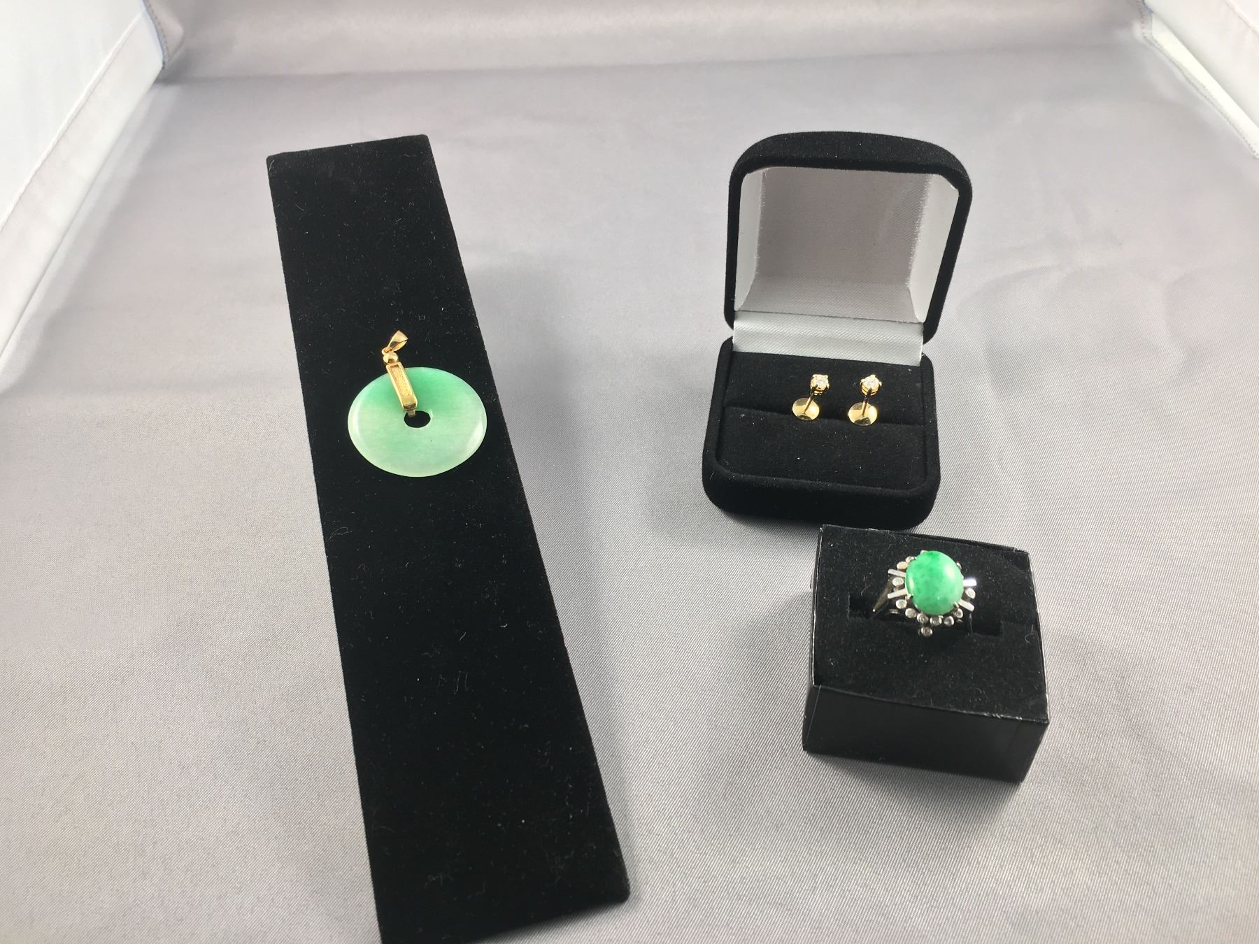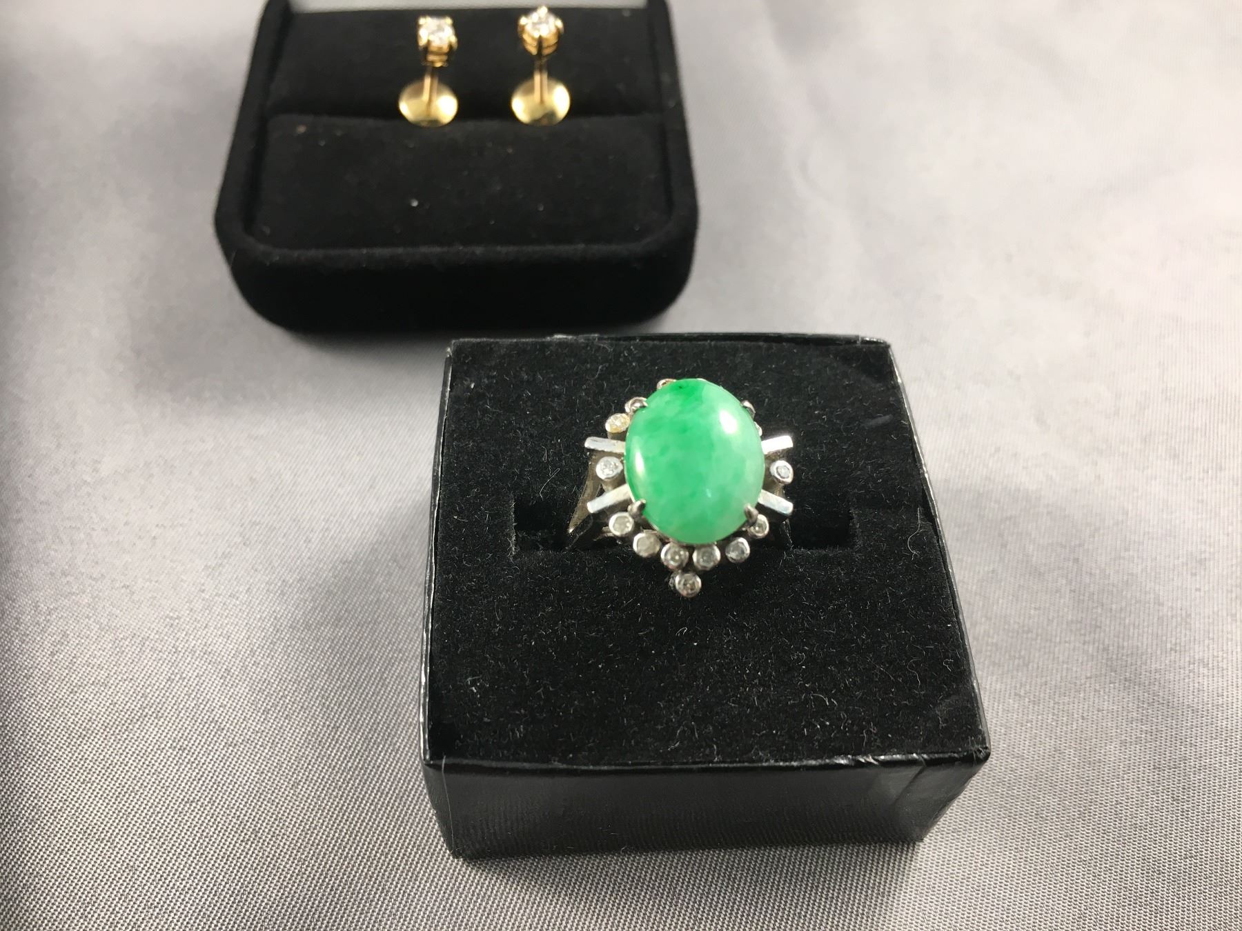 PAIR OF 18KT YELLOW GOLD DIAMOND EARRINGS. FOUR CLAW SET WITH A ROUND BRILLIANT CUT DIAMOND APPROX. 0.15 CARAT. COMBINED WEIGHT APPROX. 0.30 CARAT. REPLACEMENT VALUE: $1350.00. 1 ROUND BURMESE JADEITE HOLOLITH "BI" SHAPED PENDANT WITH 14KT YELLOW GOLD CENTER BAIL. REPLACEMENT VALUE: $950. LADIES 8KT WHITE GOLD NATURAL BURMESE JADEITE & DIAMOND SET DRESS RING. SET WITH 16 SINGLE CUT DIAMONDS APPROX. 0.16 CARAT & 1 CABOCHON NATURAL JADEITE VALUE: $975.00