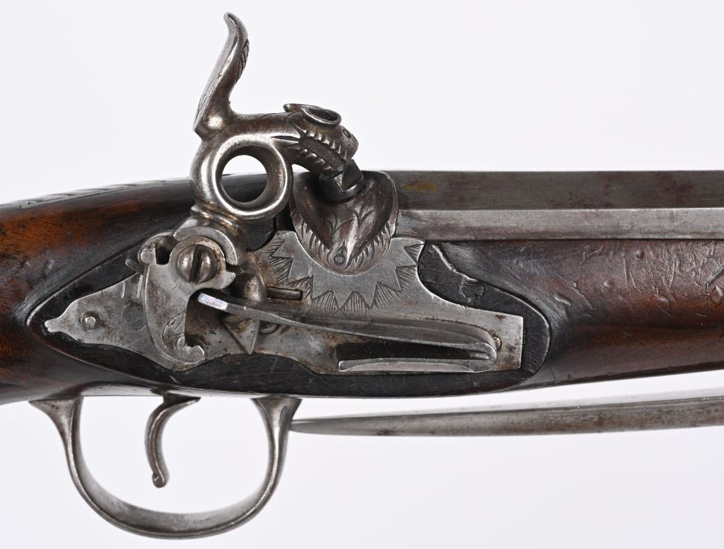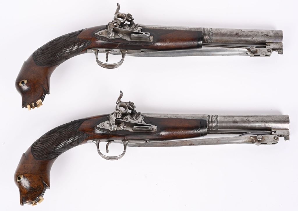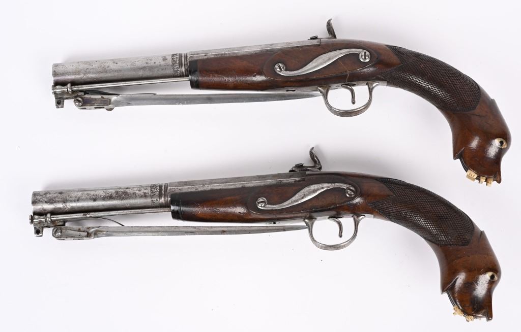 SERIAL NUMBER N/A BARREL 8 1/8" CALIBER 58 SMOOTHBORE MANUFACTURED CIRCA 1840'S. Part octagon barrels with wedding band Small Miquelet locks with 7 inch triangular sprung bayonet on underside retained by sliding trigger guard. One piece walnut stock with checkered wrist and carved dog face at but with inlaid eyes and bone implanted teeth. Breech is marked with deep gold touch mark "BM" . Locks are very ornate with cock loosely designed to look as an animal attaching the the nipple open mouthed. CONDITION, Very good as found and uncleaned. The stocks are very fine with excellent bores. Locks operate properly. Bayonets operate and lock into position properly. Stocks are good with one having an older crack emanating from the trigger upward on both sides. ANTIQUE