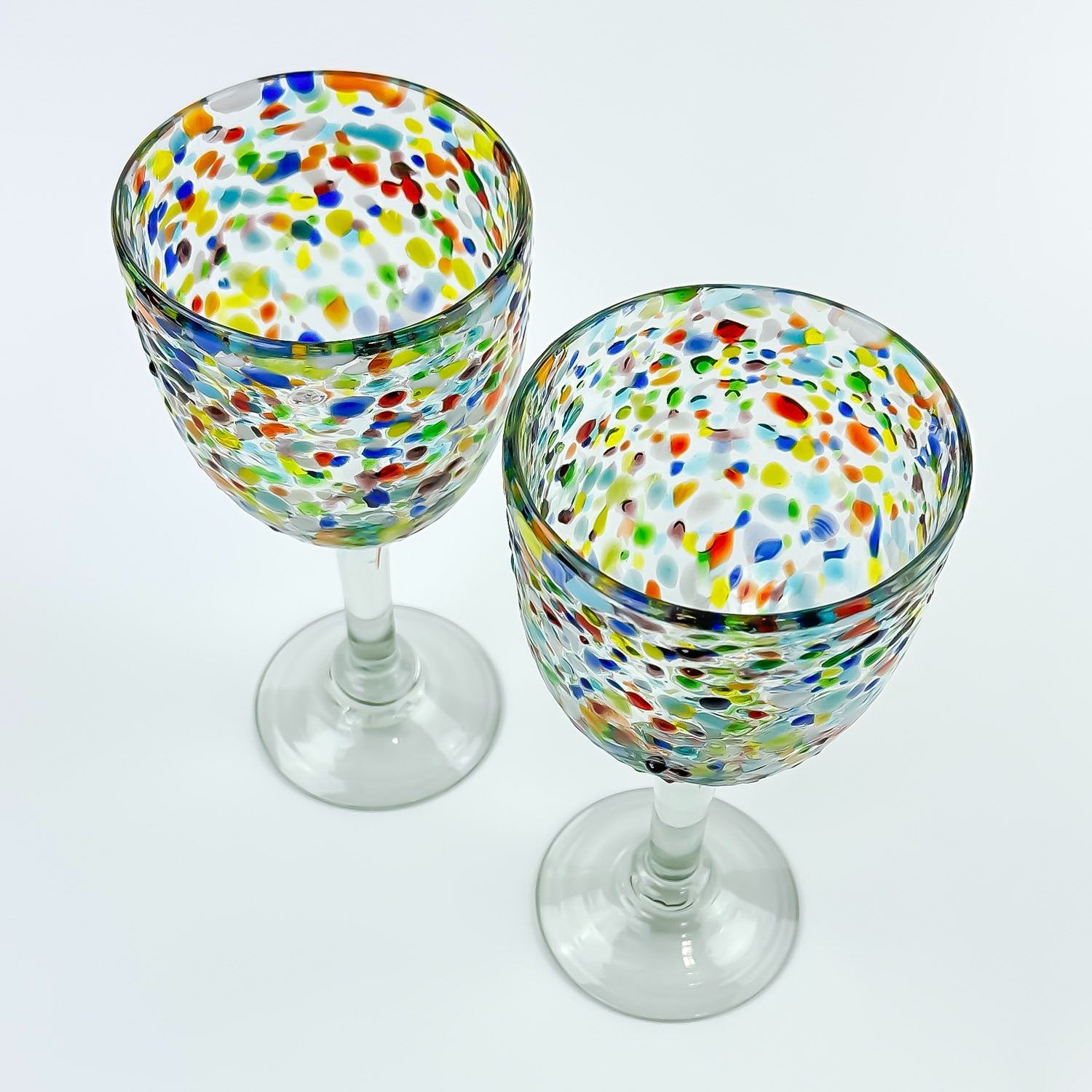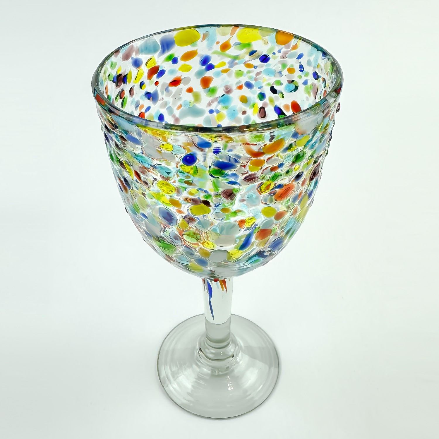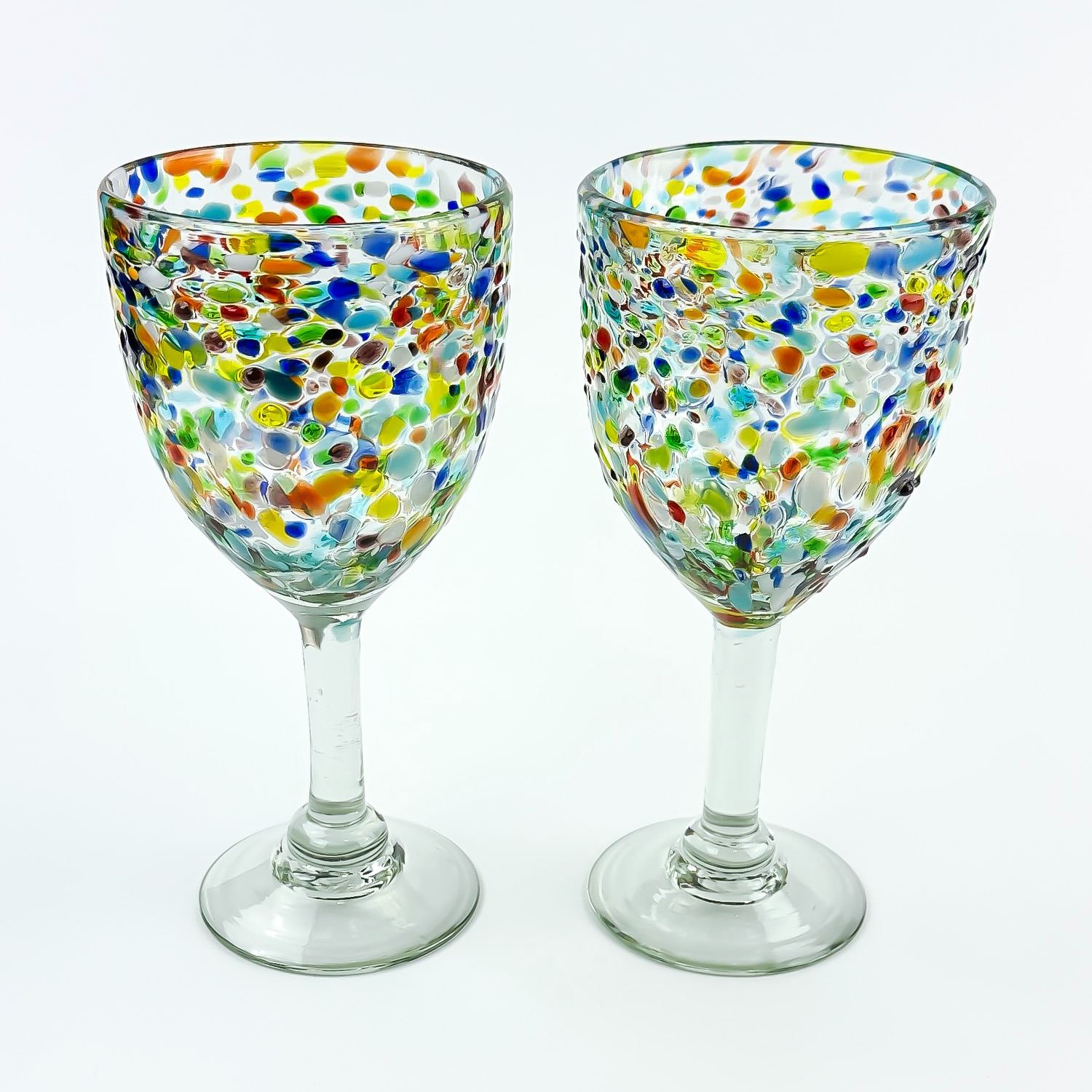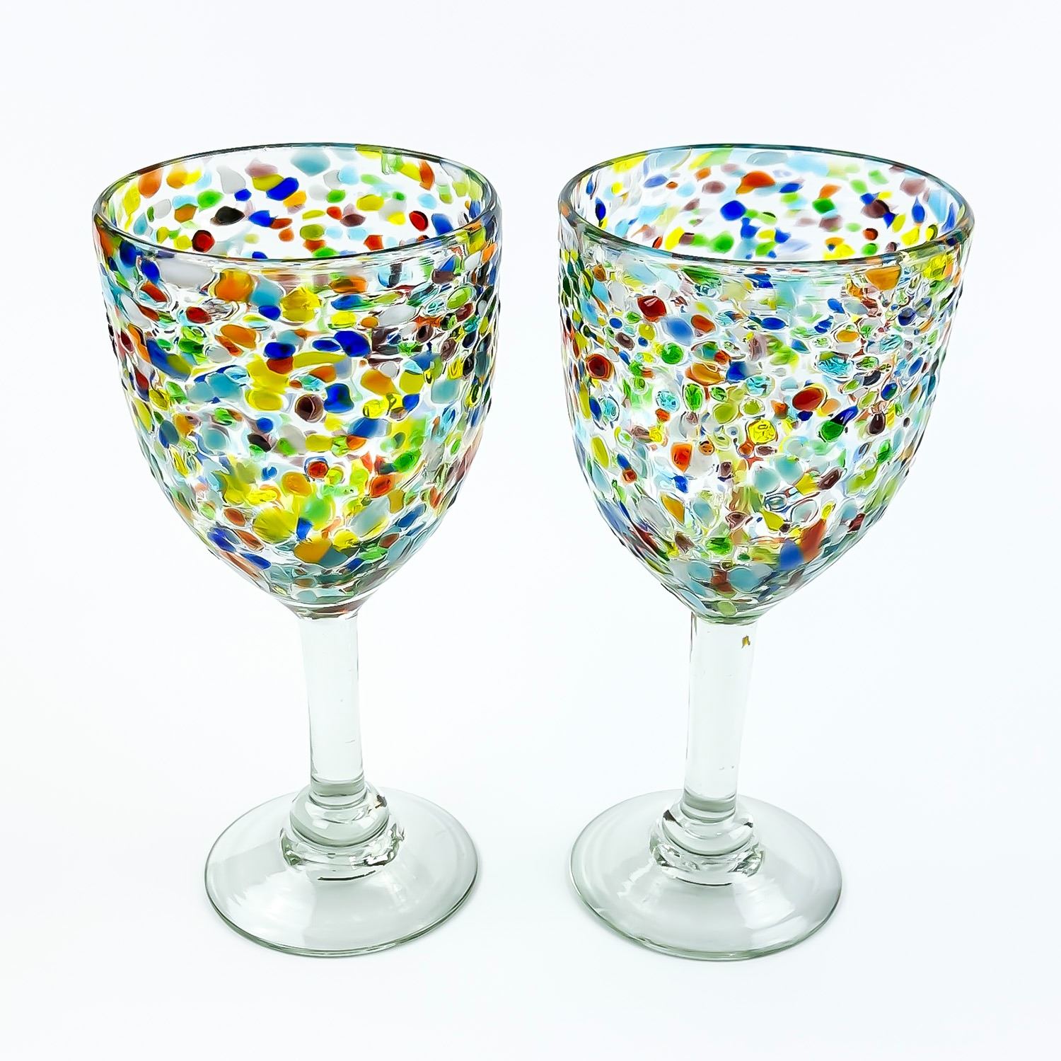 #8609 - HAND MADE CONFETTI GLASS WINE GOBLETS WITH RAINBOW COLOURS. NO CRACKS, CHIPS OR REPAIRS. HOME, BAR BARWARE DECOR - ALCOHOL OR WATER GLASSES. THEY MEASURE 7.5” (19 CM) TALL BY 3.5” (9 CM) TOP DIAMETER.