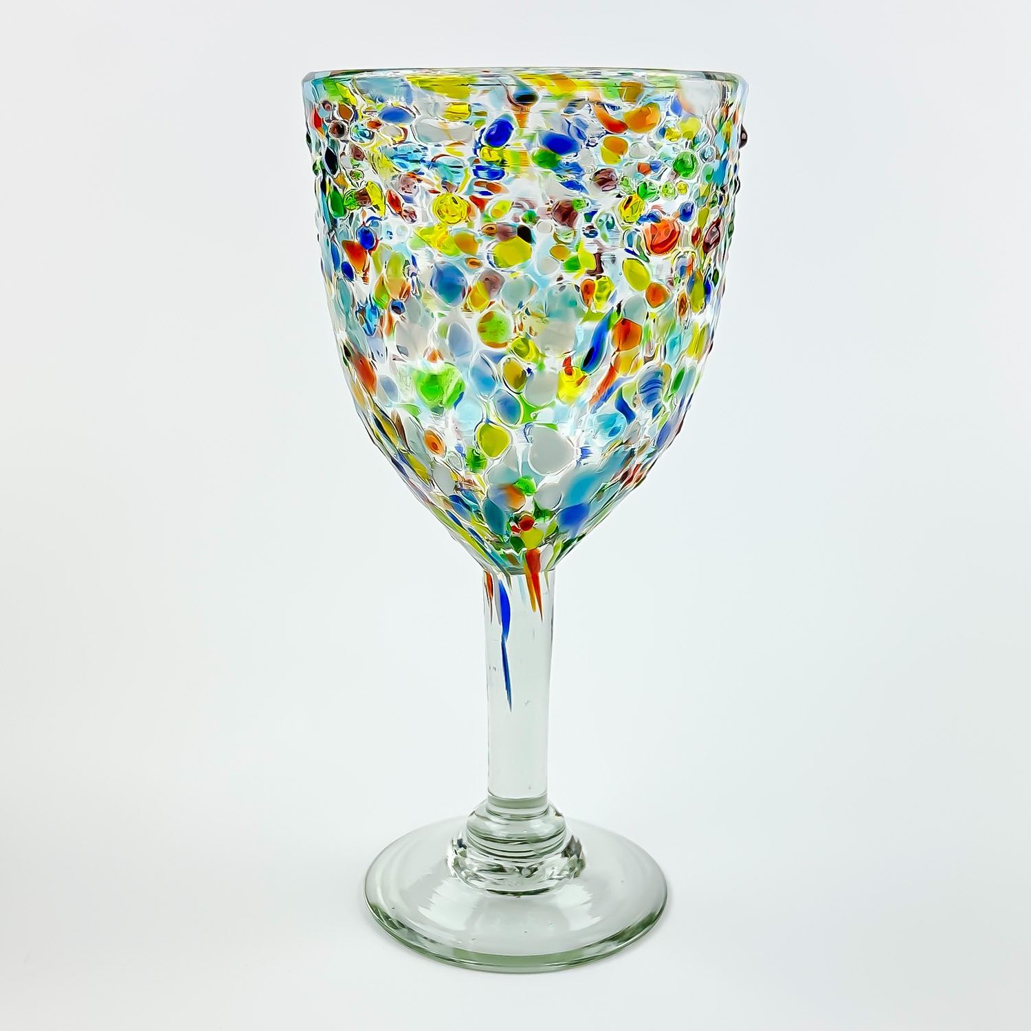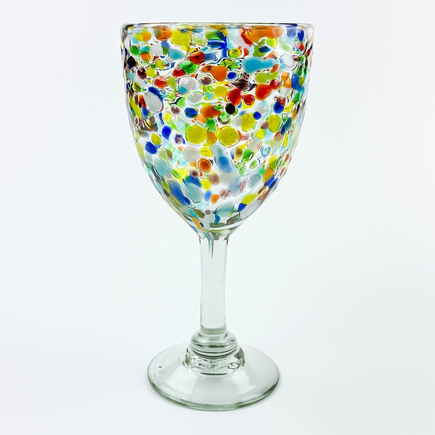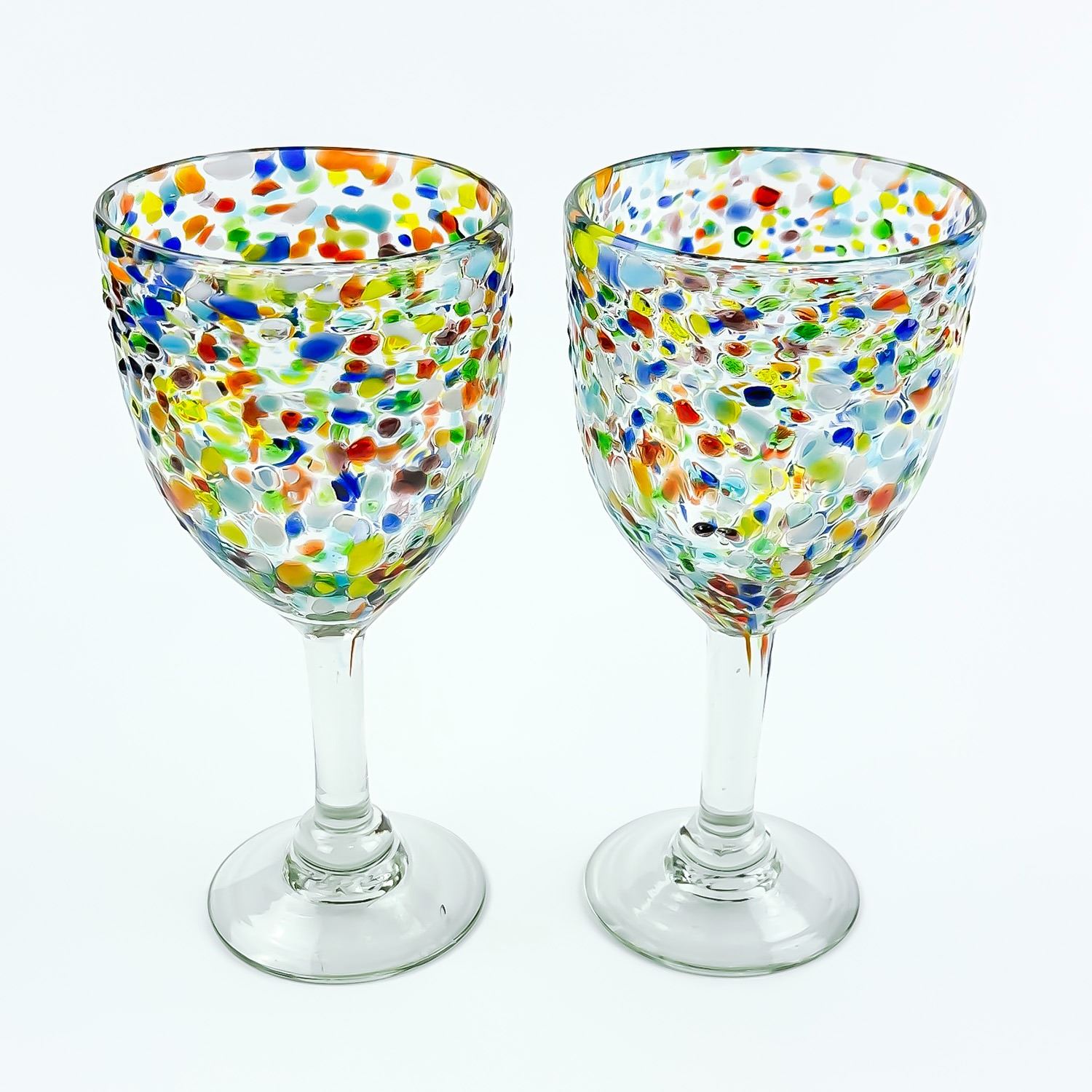 #8609 - HAND MADE CONFETTI GLASS WINE GOBLETS WITH RAINBOW COLOURS. NO CRACKS, CHIPS OR REPAIRS. HOME, BAR BARWARE DECOR - ALCOHOL OR WATER GLASSES. THEY MEASURE 7.5” (19 CM) TALL BY 3.5” (9 CM) TOP DIAMETER.