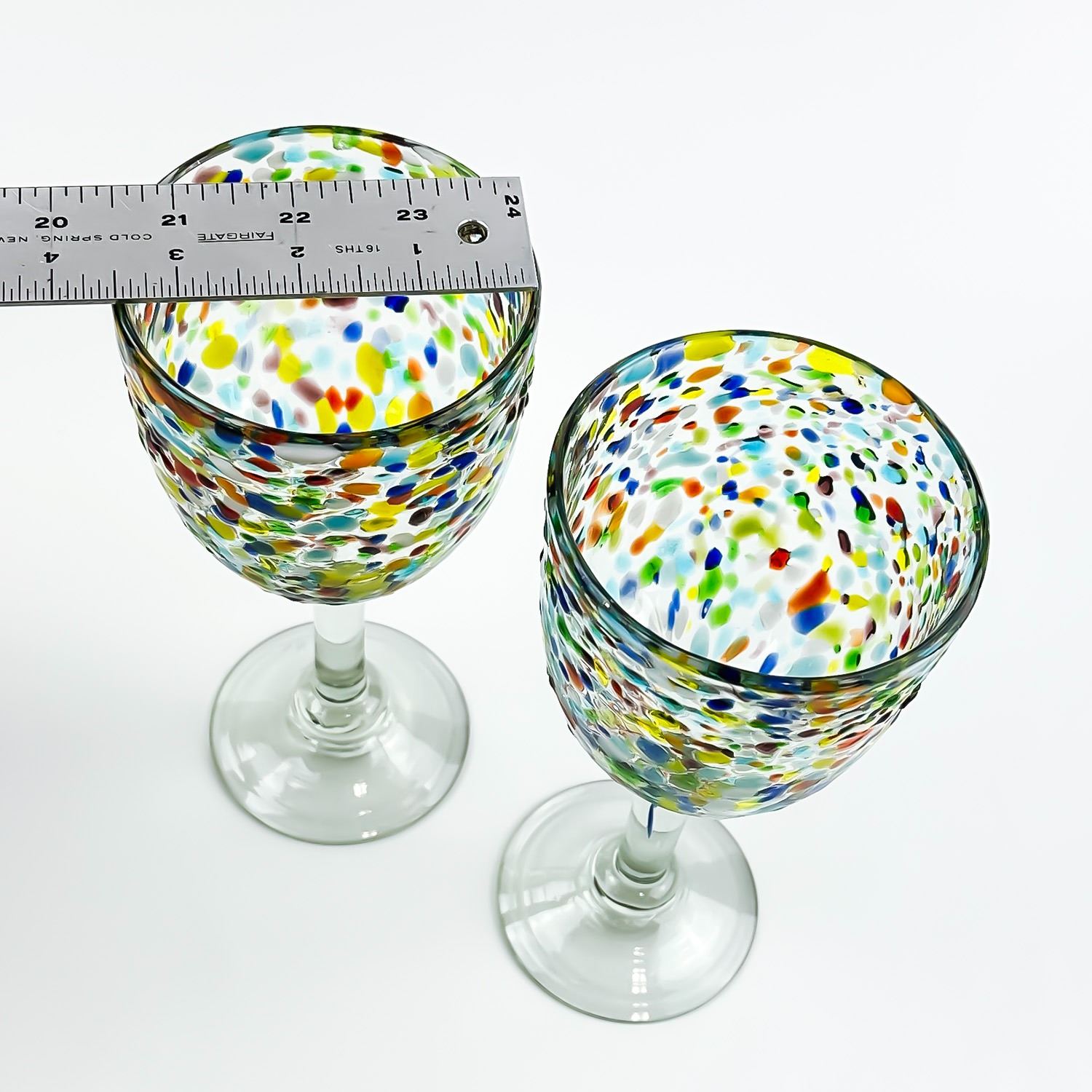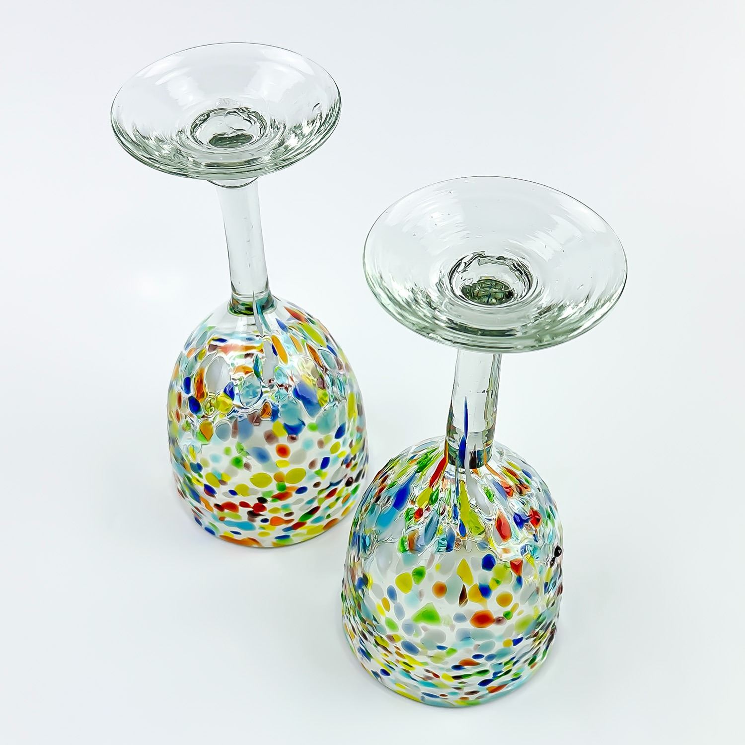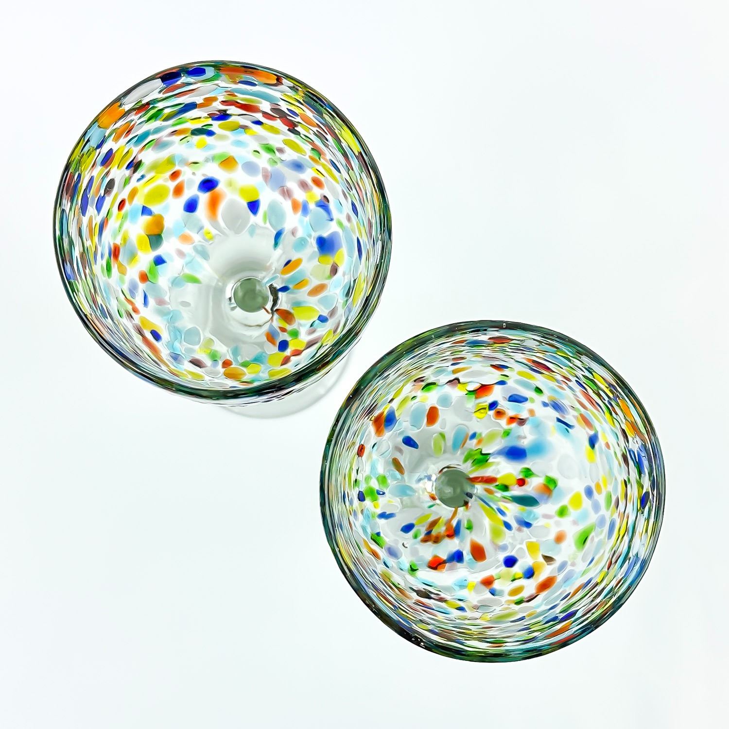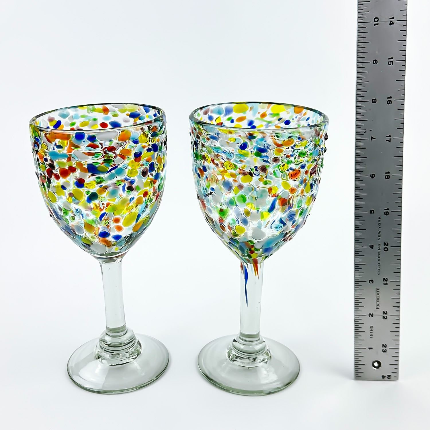 #8609 - HAND MADE CONFETTI GLASS WINE GOBLETS WITH RAINBOW COLOURS. NO CRACKS, CHIPS OR REPAIRS. HOME, BAR BARWARE DECOR - ALCOHOL OR WATER GLASSES. THEY MEASURE 7.5” (19 CM) TALL BY 3.5” (9 CM) TOP DIAMETER.