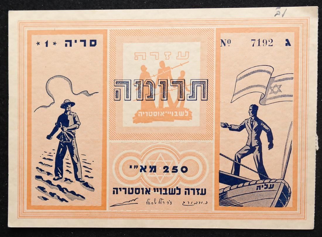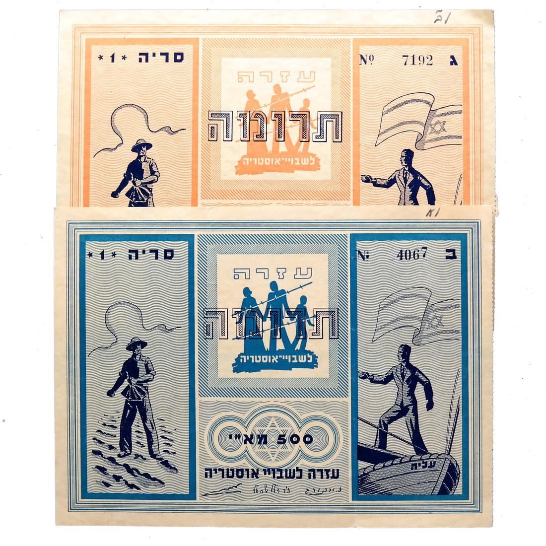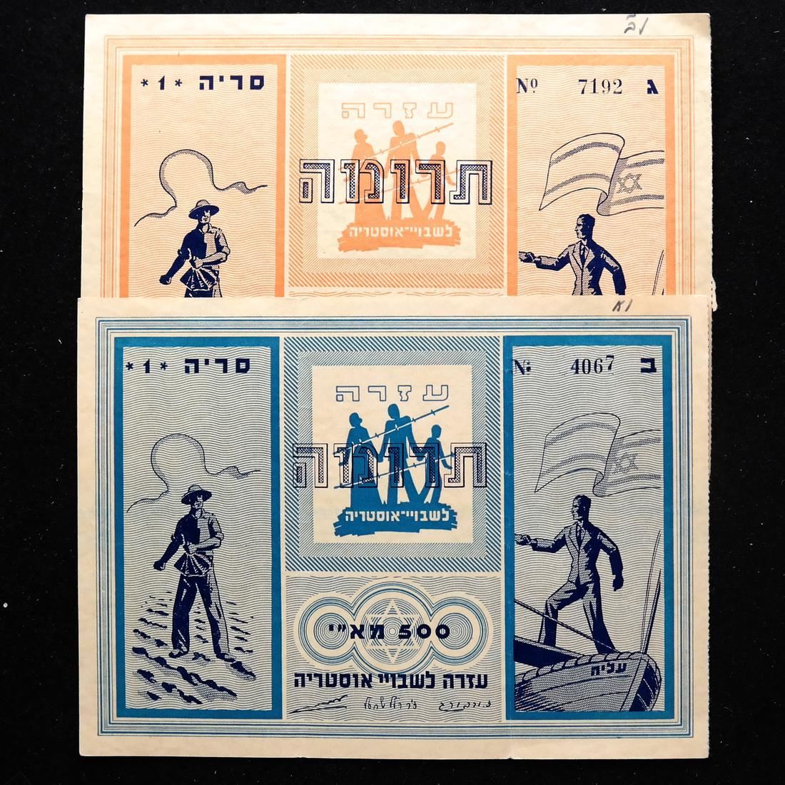 To raise funds for Austrian Jewish immigrants to Palestine, two different denominations, on watermarked paper and with serial numbers, sound and Very Fine.