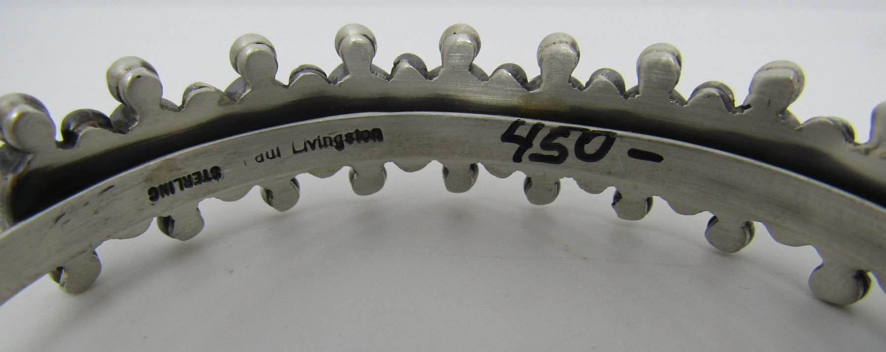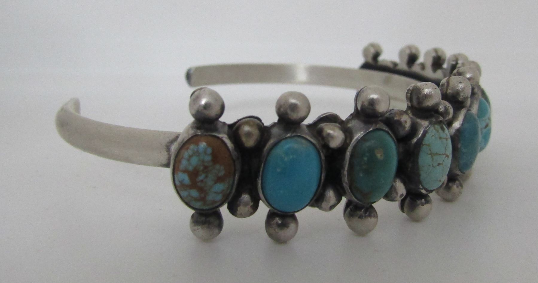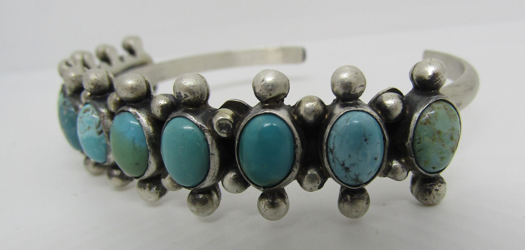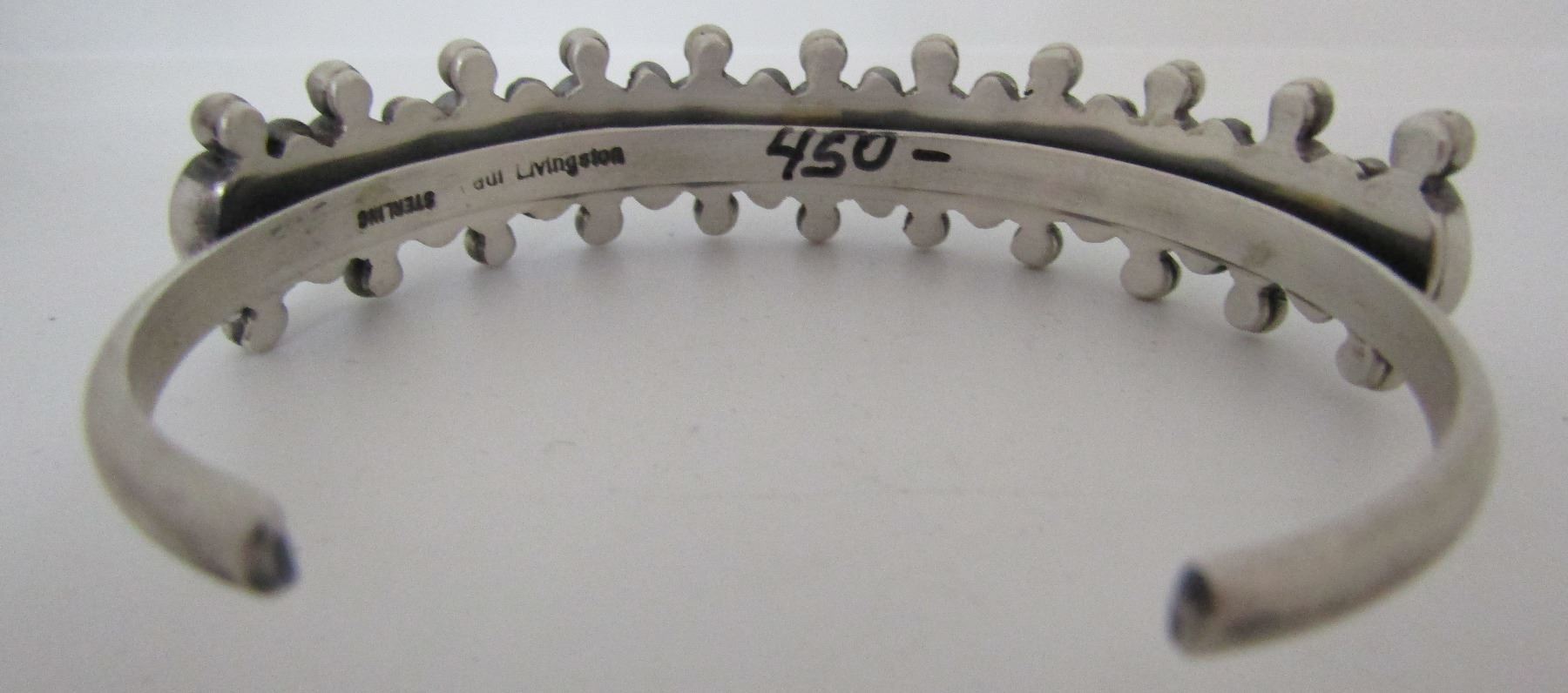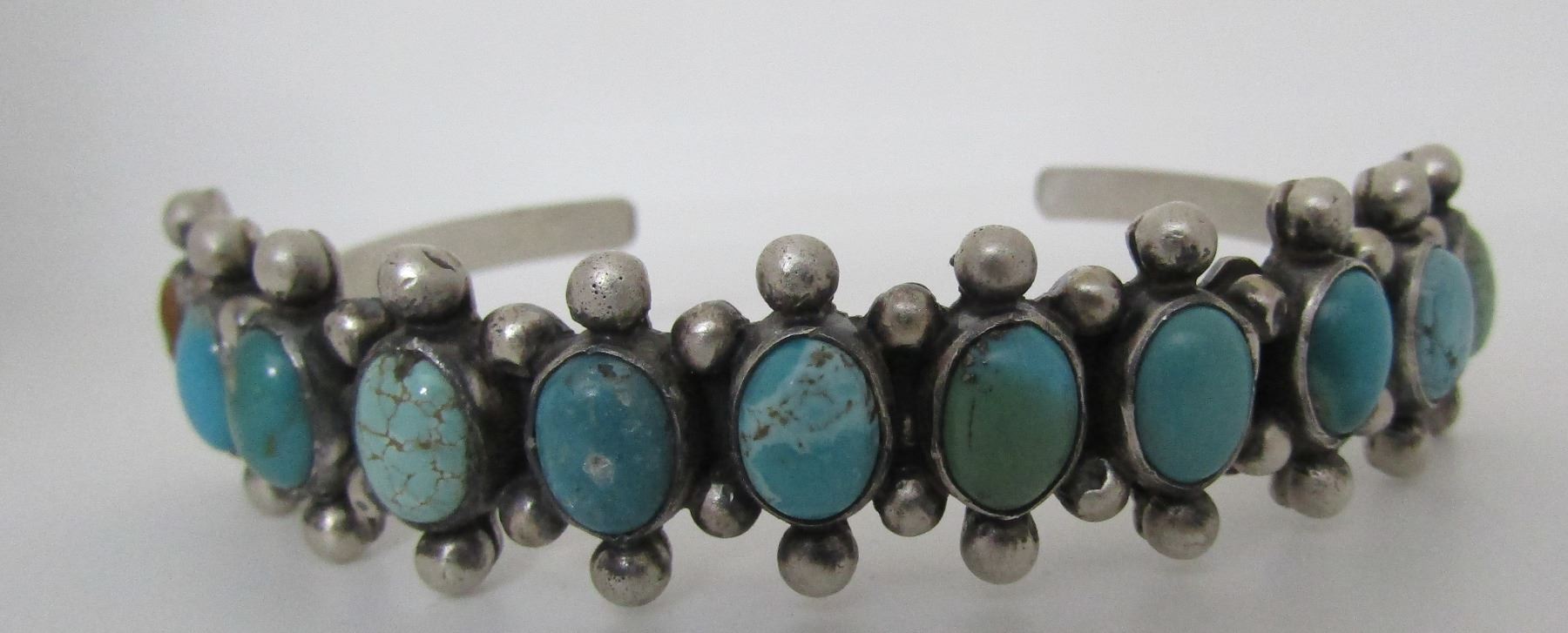 VINTAGE ESTATE HALLMARKED "PAUL LIVINGSTON STERLING" SILVER. NATIVE AMERICAN SOUTHWEST NAVAJO INDIAN JEWELRY. 15.5MM WIDE WITH A RAINBOW OF GENUINE TURQUOISE COLORS; SOME SPIDERWEB. MEASURES 7' INSIDE INCLUDING 11/8" GAP. WEIGHS 28.8 GRAMS. VINTAGE ESTATE EXCELLENT USED CONDITION. USA SHIPPING $5.