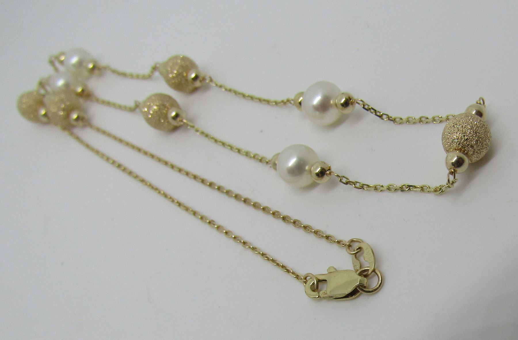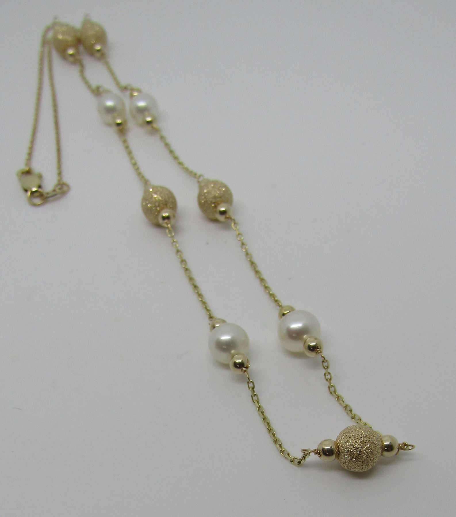 16 INCH LONG WITH 7MM GOLD BEADS AND 7MM PEARLS. 14K YELLOW GOLD, WEIGHS 3.7 GRAMS. USA SHIPPING $5