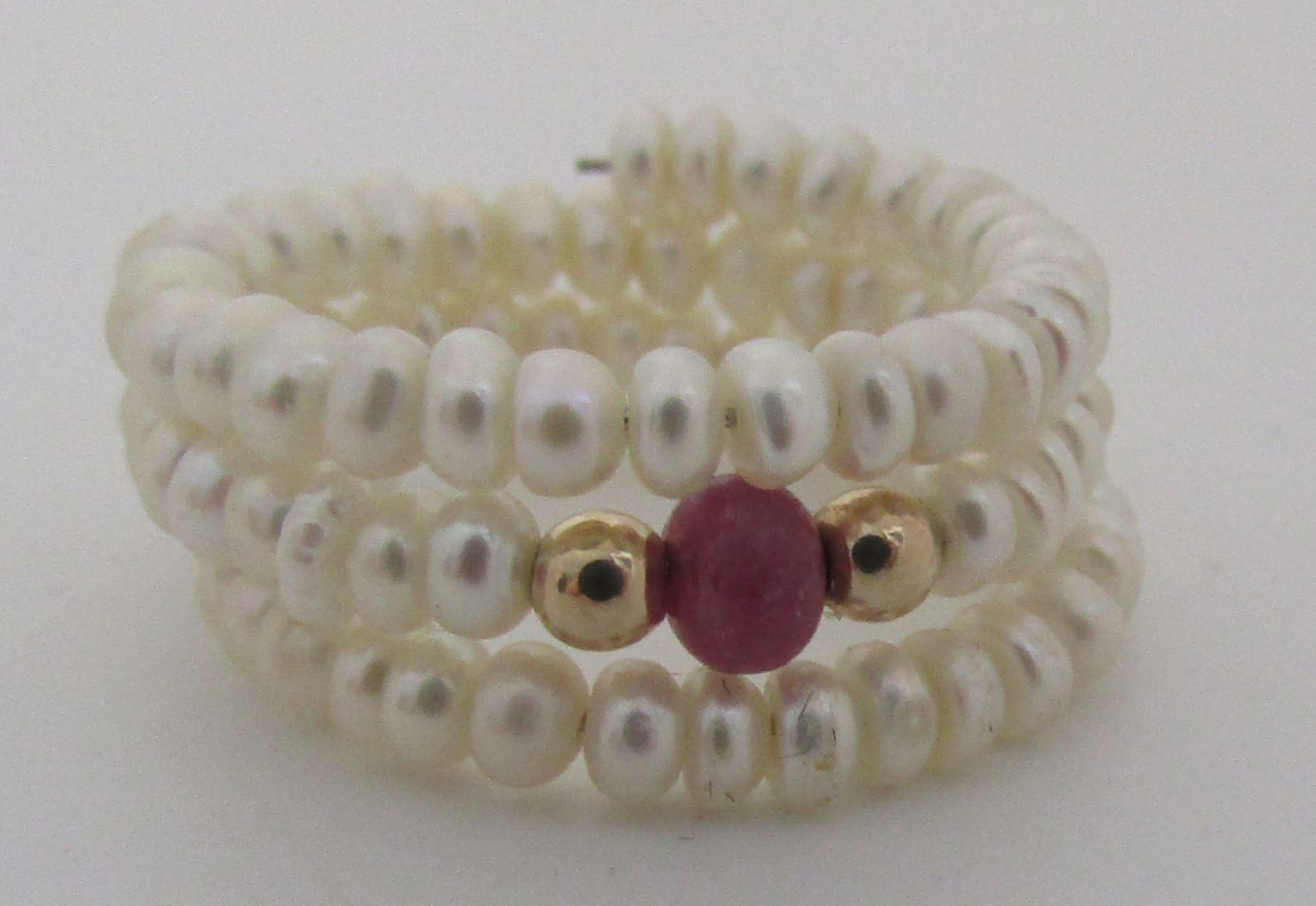 ALL GENUINE RUBY, PEARL AND 14K YELLOW GOLD RING. 10MM WIDE. WEIGHS 2.7 GRAMS. ADJUSTABLE FROM SIZE 6 TO SIZE 9. USA SHIPPING $5.