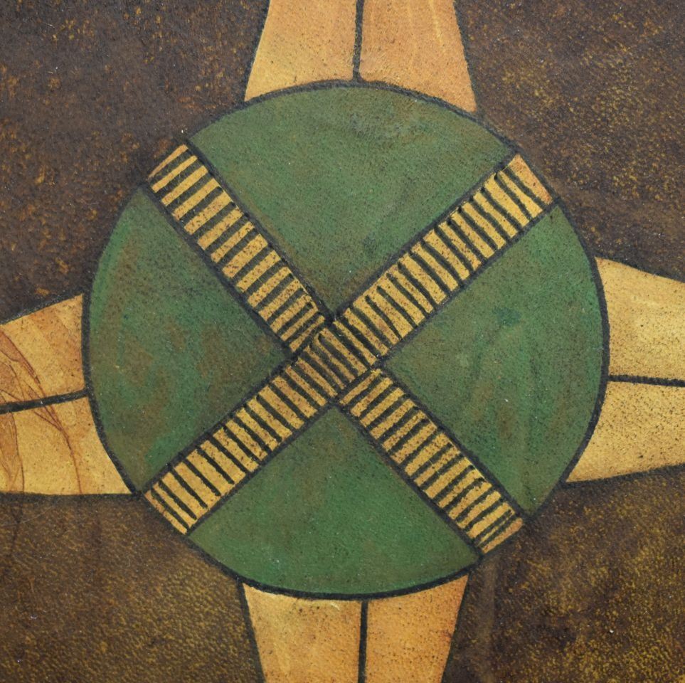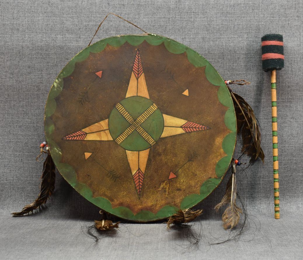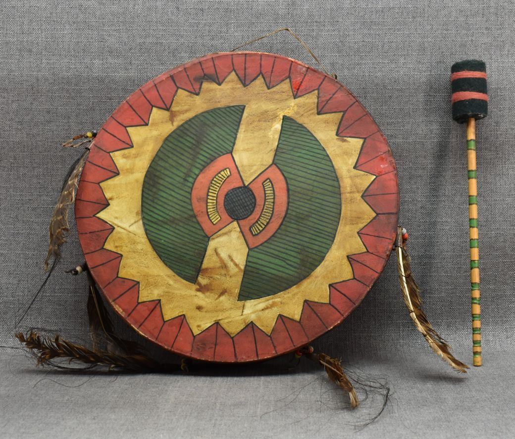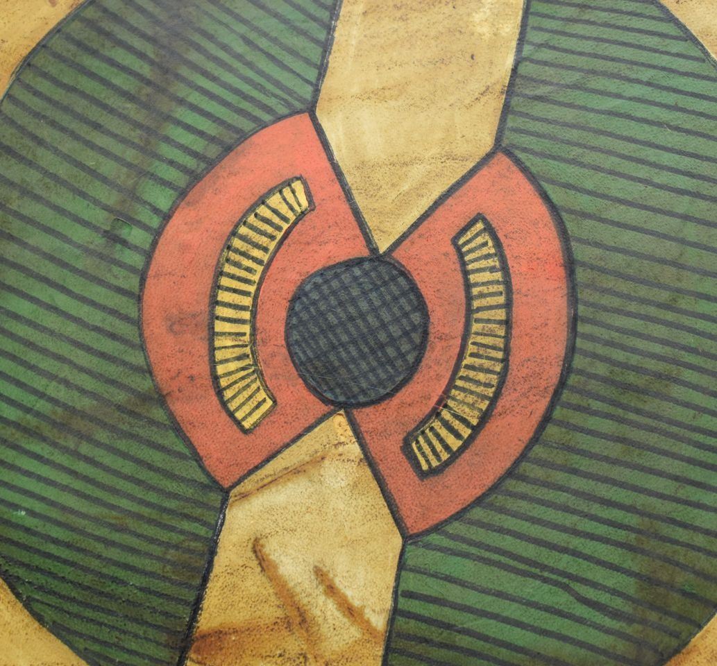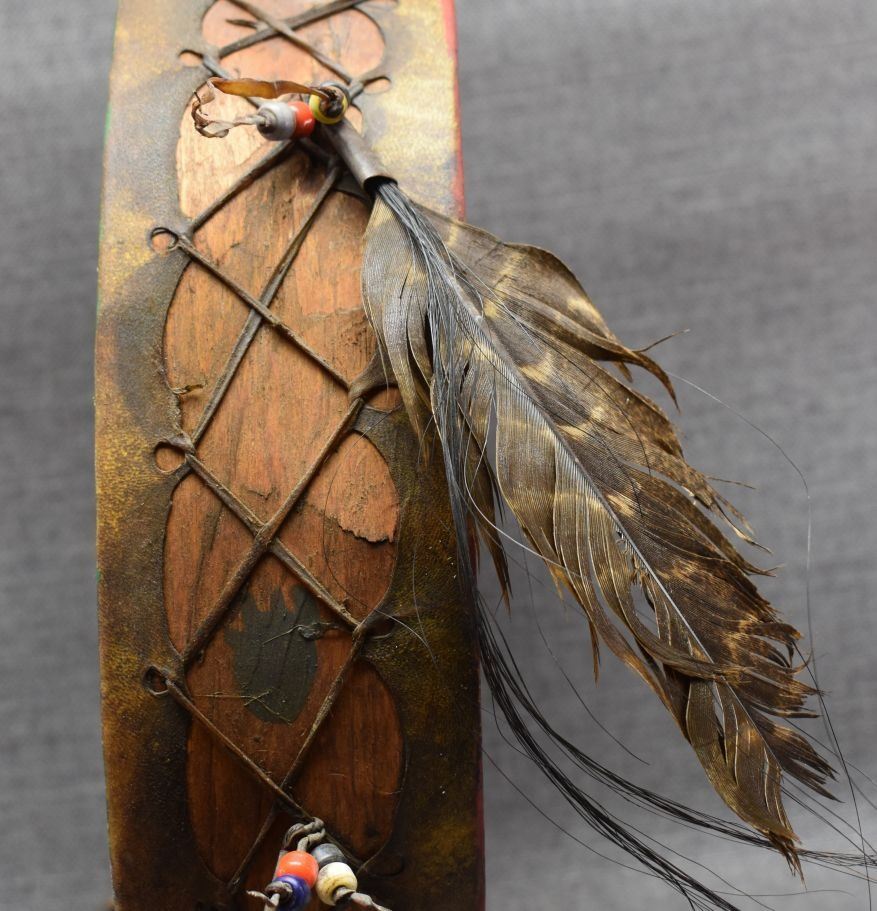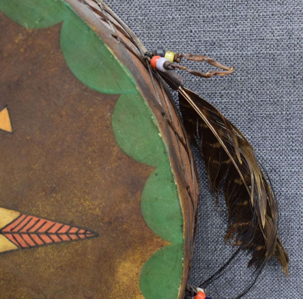 1970-80's plains Indian, made from wood and rawhide with painted design 15.5" diameter