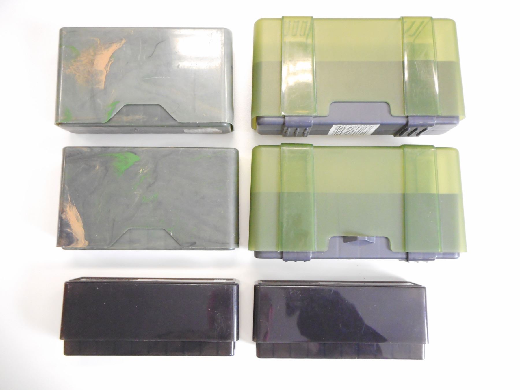 PLASTIC AMMO CASES , 6 PLASTIC AMMO CASES, SOME STAMPED .378 WBY MAG, 375-300 REM, .280 REM264,270 WIN, 30-06, 338, 7MM