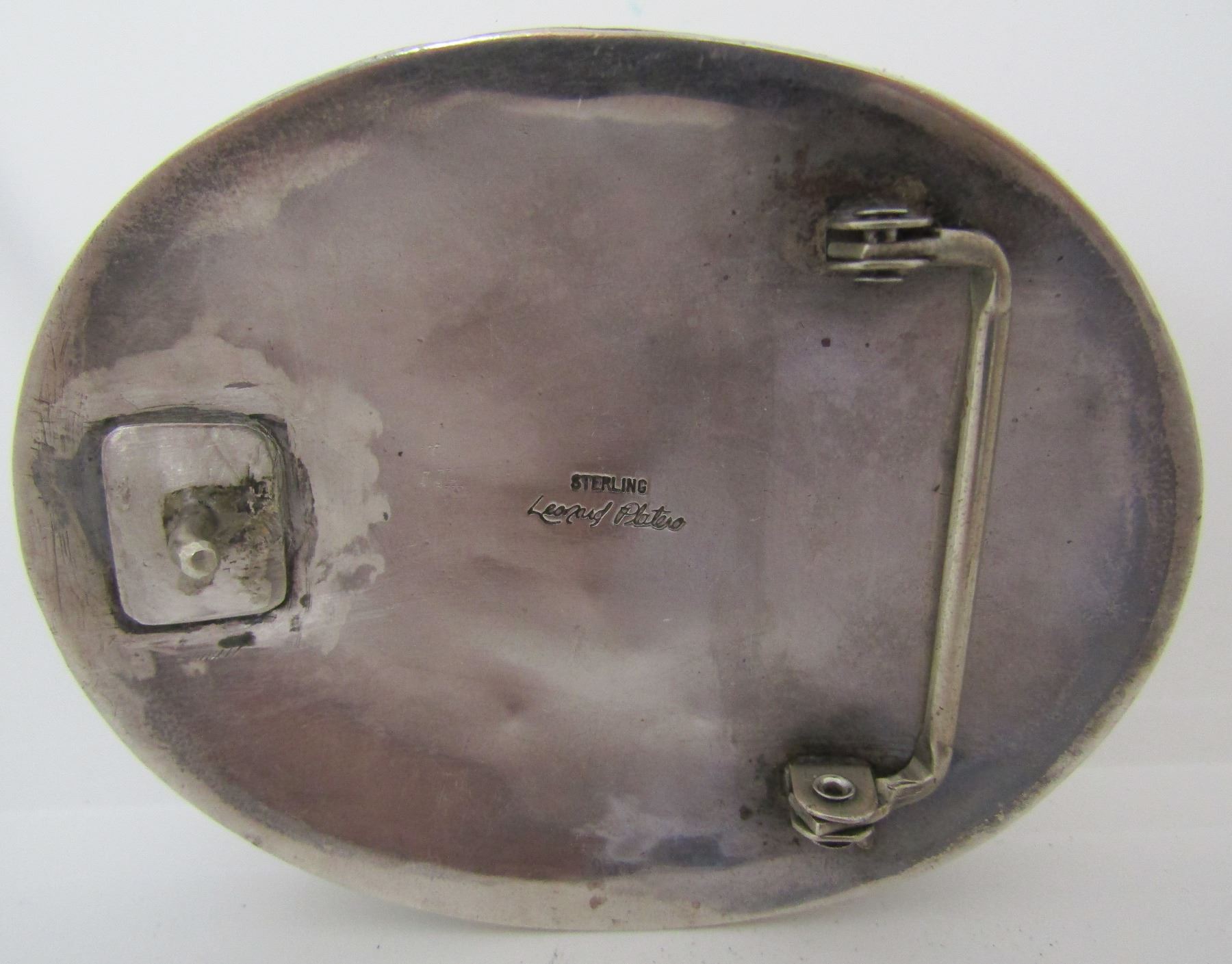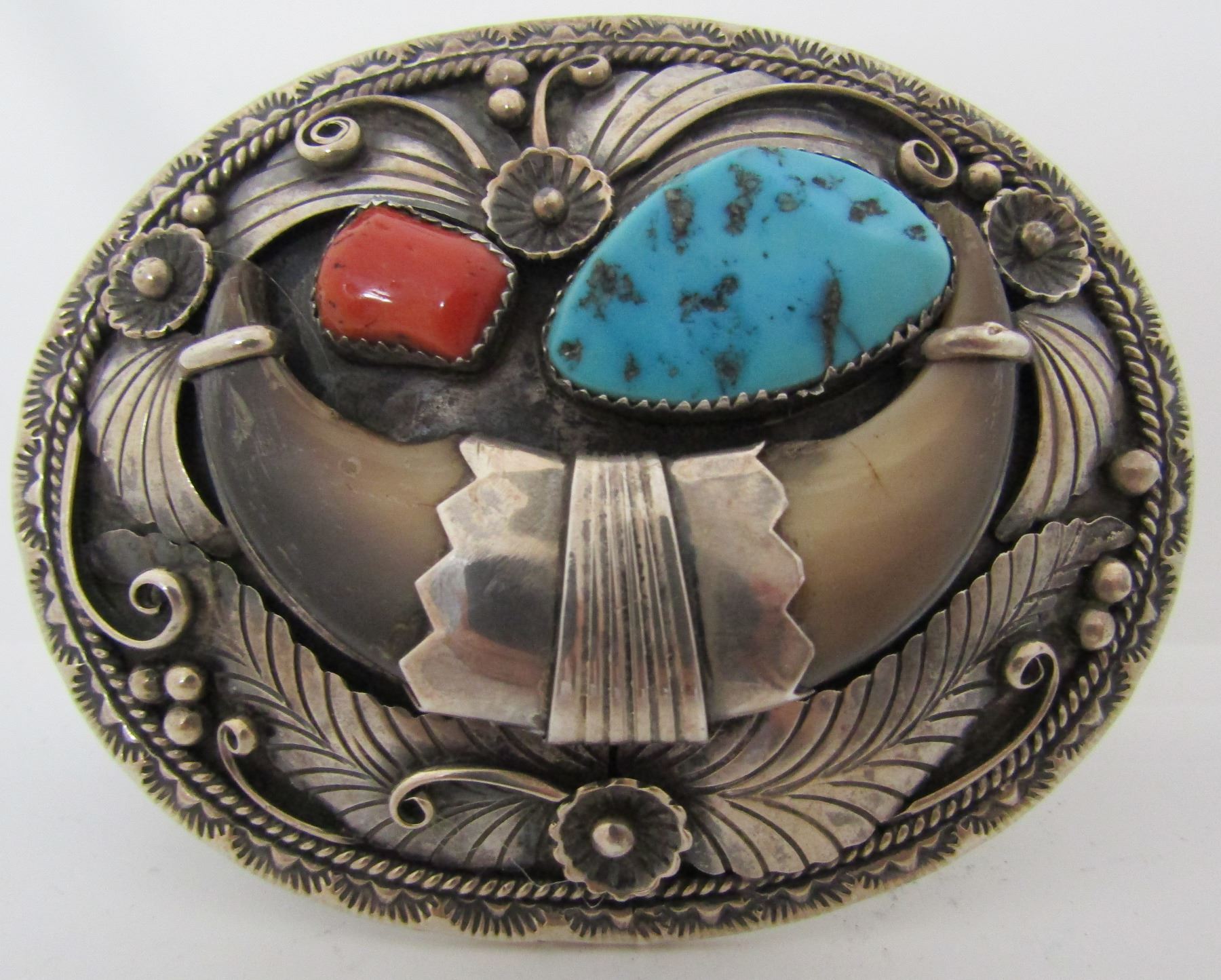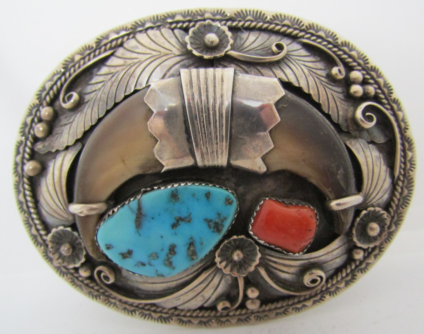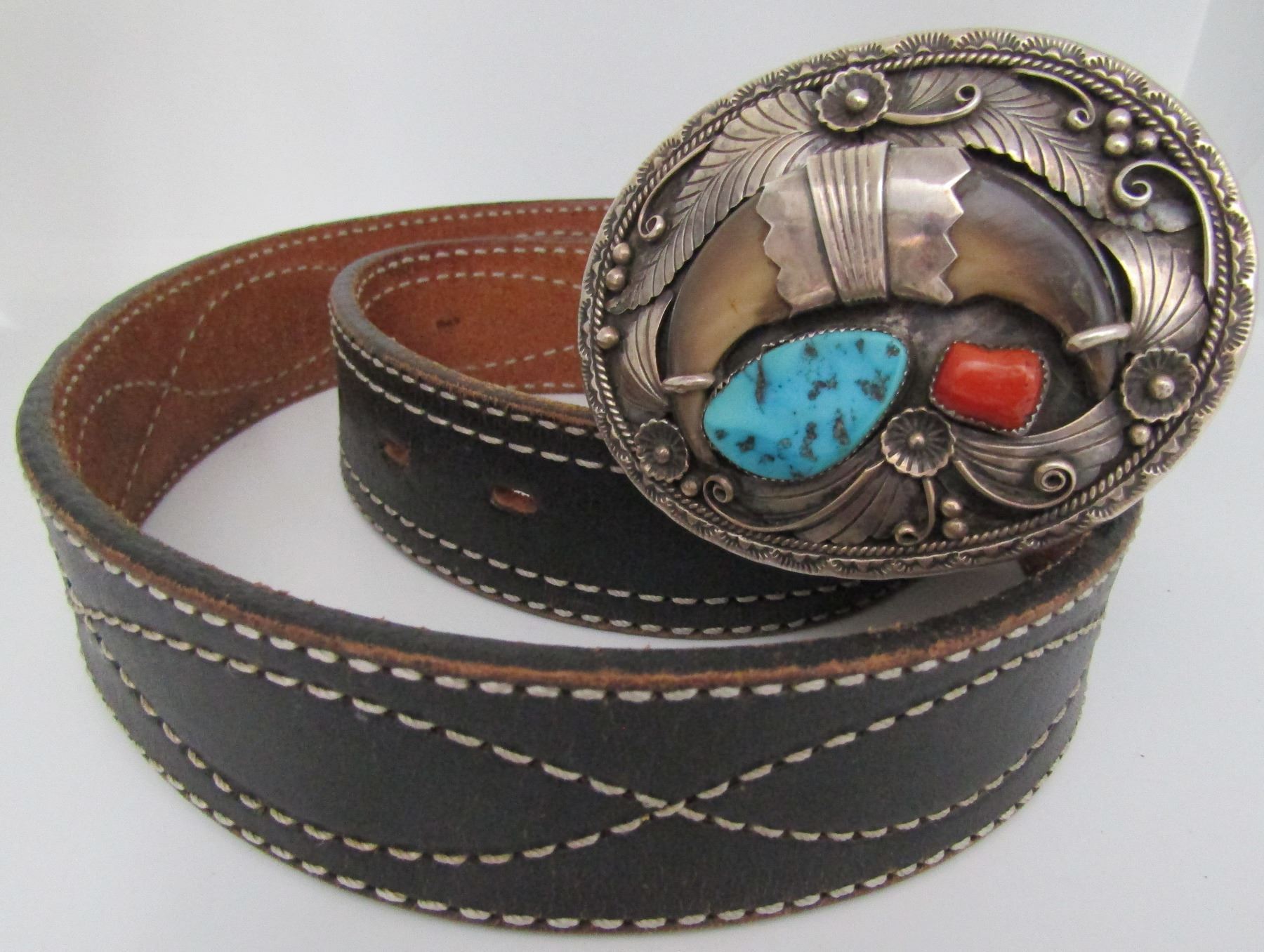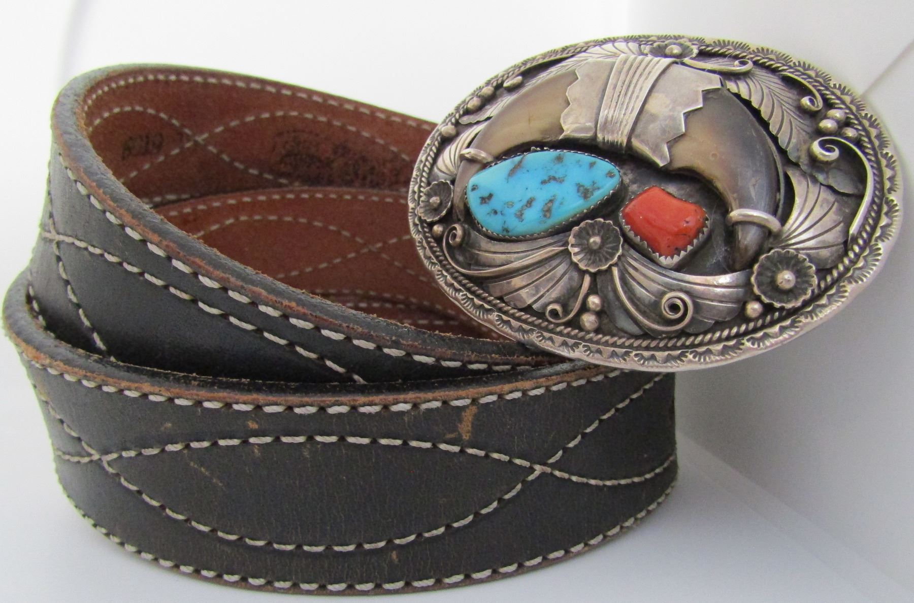 SIGNED "LEONARD PLATERO STERLING" SILVER. VINTAGE ESTATE NATIVE AMERICAN SOUTHWEST NAVAJO INDIAN JEWELRY. MOUNTED WITH 2 BEAR CLAWS, RED CORAL AND ATURQUOISE STONE. BUCKLE MEASURES 69MM TALL BY 87MM WIDE.WEIGHS 71.8GRAMS. LEATHER 40" LONG BY 1.5",SIZE 36, FOR 32 TO 36. HANDMADE IN TEXAS, USA. USA SHIPPING $15.