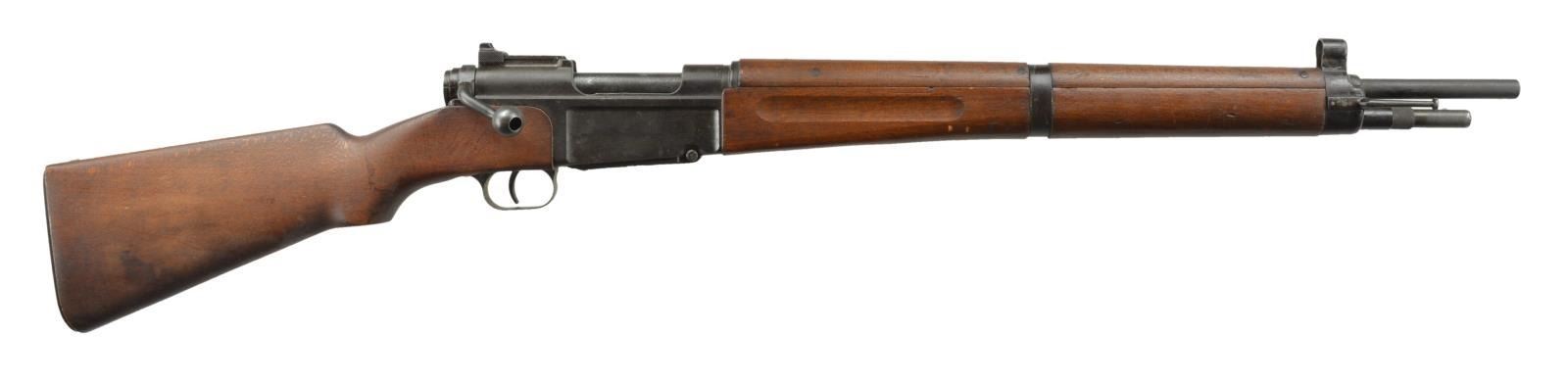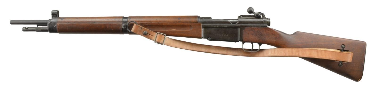 Cal. 7.5 French. S# P29243 (1947-1948). France's last standard infantry bolt action rifle. Bbl. 22.6". Front band has protected blade front sight, stacking bar & spike bayonet that stores inside stock. CAI import marked receiver w/ matching numbered bolt, trigger guard bow, floorplate & arsenal replacement walnut stock set. Action has 1200m tangent rear sight & 5 rd. internal box mag. Stock set has metal buttplate & 1" sling. CONDITION: very good as arsenal reworked w/ handling marks, wear & oxidation. Metal refinished overal prior pitting. Very good bore. PROVENANCE: from the estate collections of Charles P. Obremski. (22-1327/MD). CURIO. $300-500.