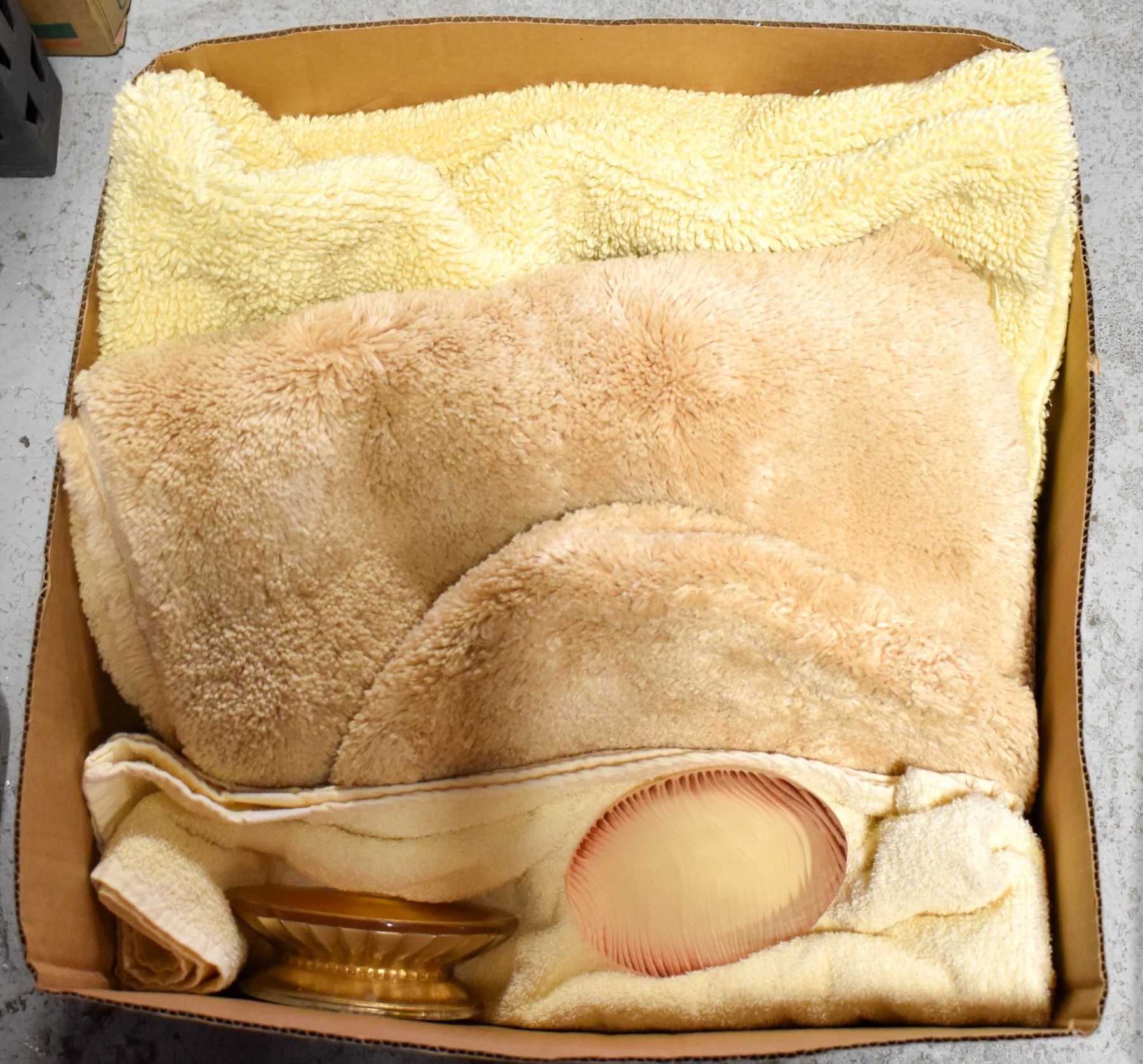 48"L), 1 LIGHT BROWN BATH MAT (21"W X 34"L), TOILET COVER, 1 BATH TOWEL AND 2 DECORATIVE SOAP HOLDERS