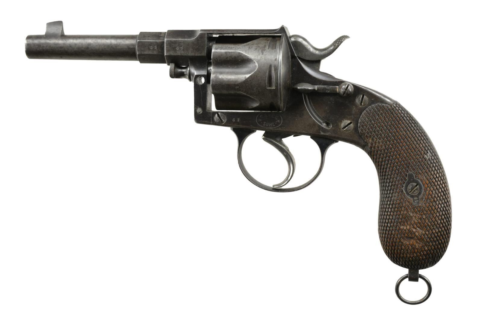 SA REVOLVER BY V.C.S.- C.G.H. OF SUHL. Cal. 10.55x25R. S# 61. The 4 3/4" bbl. is stepped from oct. to rnd. w/ integral blade front sight. Blued finish frame w/ in the white hammer & trigger. Matching numbers on all visible parts. 2 Piece checkered walnut grips. CONDITION: fair blue fading to gray w/ patina, marks & peppery oxidation. Good worn grips w/ moderate handling marks. Cyl. retaining pin is missing. Good bore. (01-21137/MD). ANTIQUE. $300-500.