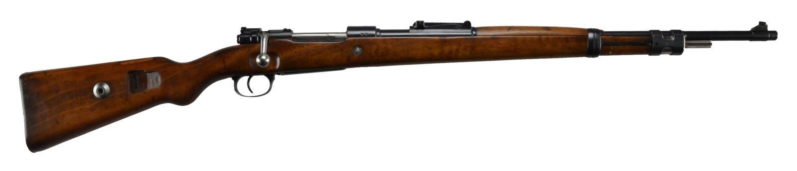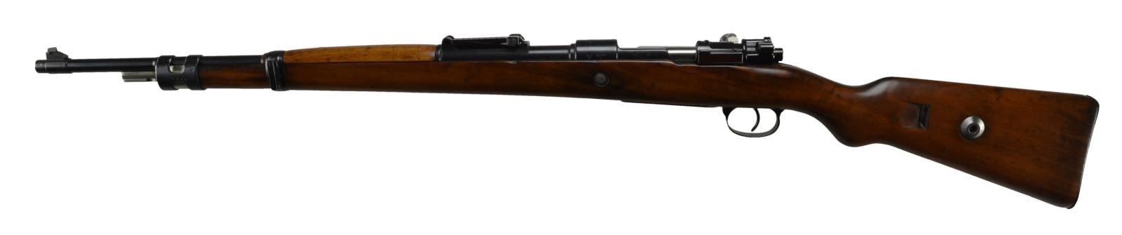 ACTION RIFLE. Cal. 8mm Mauser. S# 1699i. Bbl. 23.6" w/ blade front sight. Standard configuration w/ most parts appearing matching numbered. Non matching parts include long extractor (38) & cocking piece (9538). Early style walnut stock w/ early style "H" front bbl. band & early style slim buttplate. Markings on stock are obscured due to sanding, but appear to be matching S#. Missing ramrod. CONDITION: very good overall as arsenal refinished metal & wood. Blued bolt polished bright. Metal refinished over prior pitting, most notably on buttplate. Wood w/ moderate marks shows traces of prior German acceptance marks. Fair bore w/ worn lands & pitting in the grooves. (22-520/MD). CURIO. $350-550.