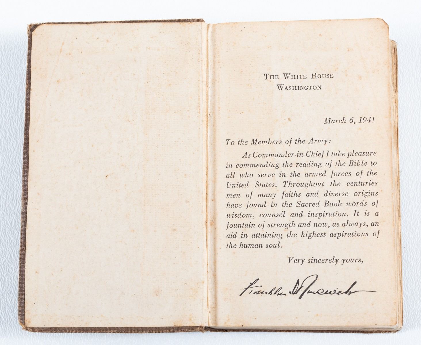 Lot of five books about Presidents or the US Government: 1. 'Protecting the President: The Inside Story of a Secret Service Agent', by Dennis V.N. McCarthy with Philip W. Smith, William Morrow and Company, Inc., 1985, 180 pages, hardcover, signed on flyleaf page by Phil Smith with included signed letter to Smith and dated March 20, 1992. 8.5 x 6 inches. 2. 'The Autobiography of Calvin Coolidge', by Calvin Coolidge, Cosmopolitan Book Corporation 1929, 247 pages, cloth-covered hardcover. 9 x 6 inches. Minor soiling on spine. 3. 'Memoirs: Volume One: Year of Decisions', by Harry Truman, Doubleday & Company, Inc., 1955, 596 pages, hardcover. 8.5 x 6 inches. Minor damage to back of dust jacket. 4. 'American Jurist: The Life of Judge Alfred P. Murrah', by Von Russell Creel, Bob Burke, and Kenny A. Franks, Western Heritage Books, 1996, 398 pages, hardcover, signed by Burke on flyleaf page and dated from July 23rd, 1996. 9 x 6 inches. 5. Copy of the New Testament for the US Army, printed in 1942, with Franklin D. Roosevelt facsimile signature on flyleaf, 607 pages, cloth-covered hardback. 5 x 3.5 inches. Cover has damage, soiling, abrasions, and minor foxing on pages.