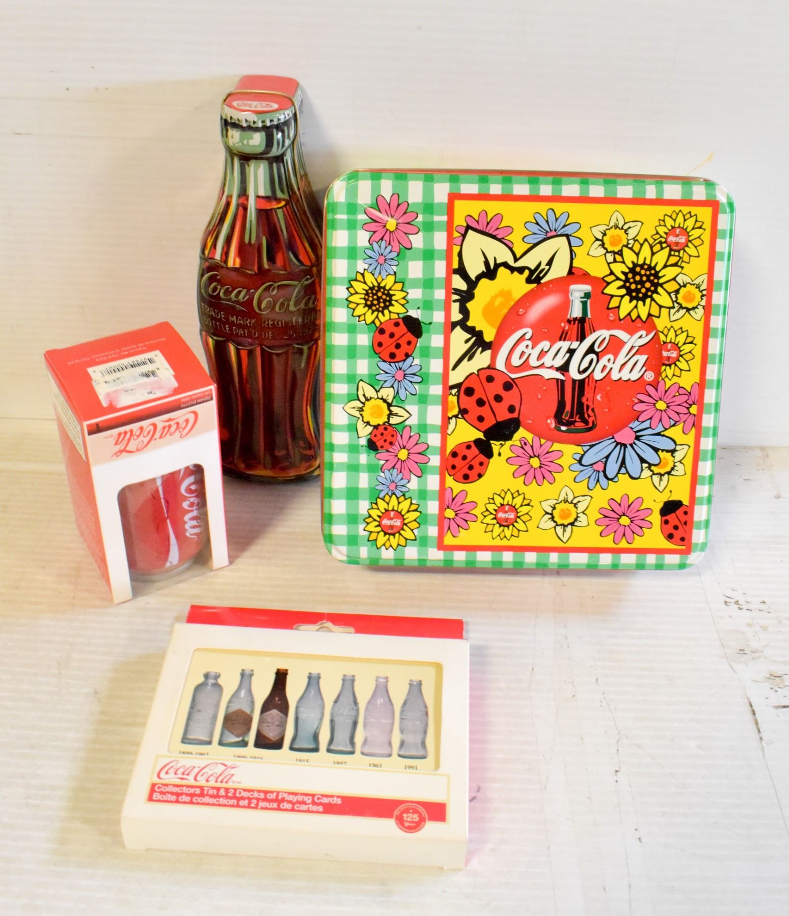 TIN WITH 2 DECKS OF CARDS, COKE CAN PUZZLE AND COKE PUZZLE IN A GREEN PLAID TIN