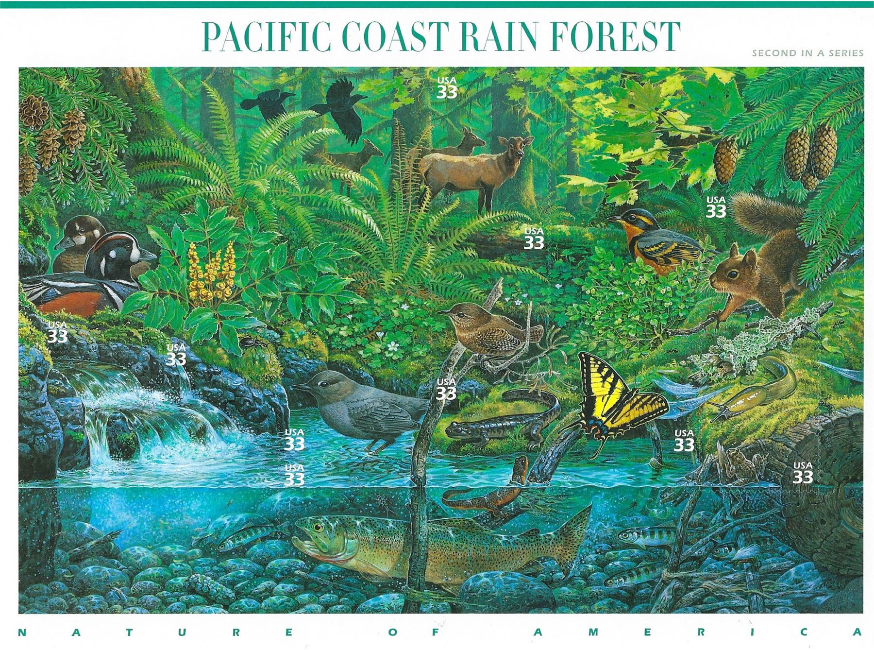 Pacific Coast Rain Forest (Nature of America), Full Sheet of 10 x 33-Cent Postage Stamps, USA 2000, Scott 3378