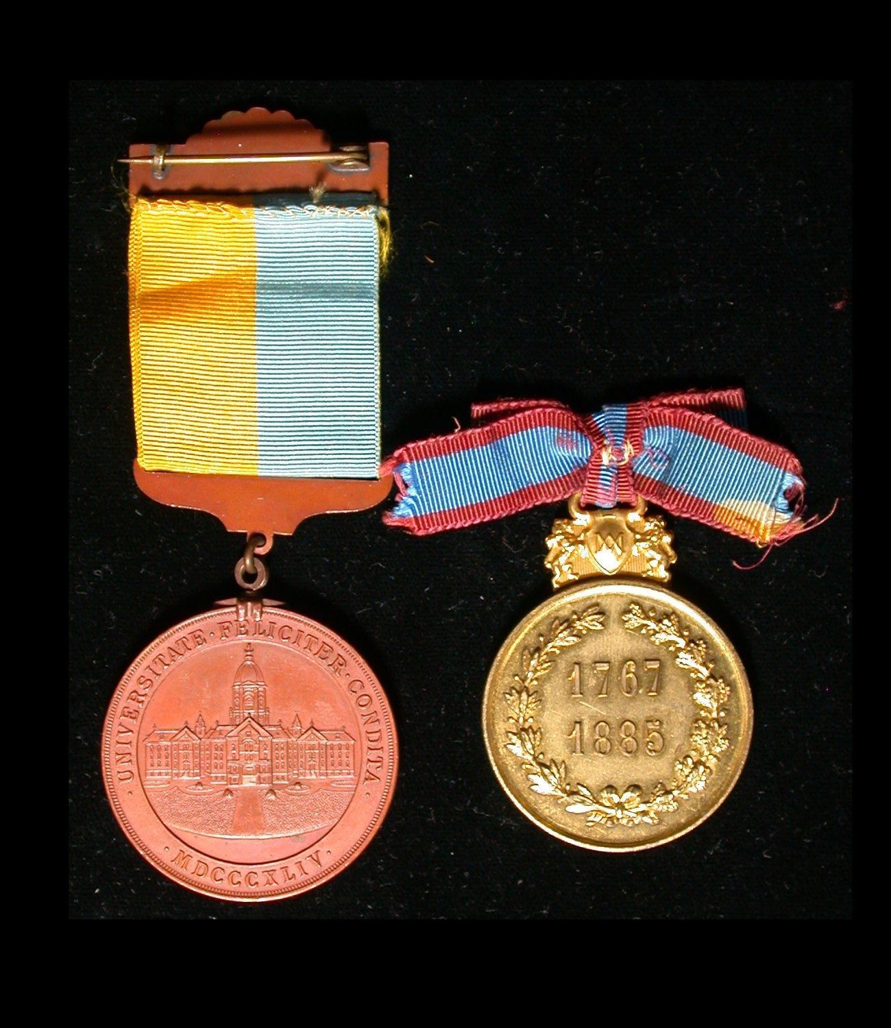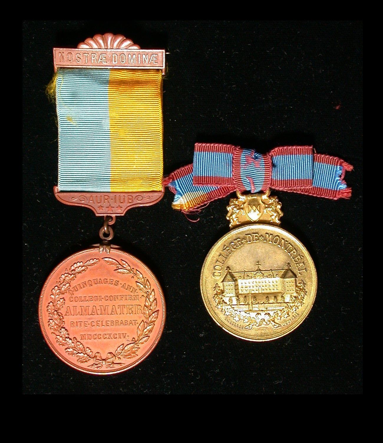 College De Montreal, 1767-1885, Lr.1220, Ae, gilt, 37.5mm, with blue and red ribbon, nice UNC. Offered together with a second medal: Obv: School at centre, "Universitate Feliciter Condita", "MDCCCXLIV" below; Rev: "Quinquages Ann Collegi-Confirm Alma Mater Rite Celebrabat MDCCCXCIV", surrounded by wreath; suspended by ribbon and upper and lower bar. Bars read "Nostrae Dominae" and "Aur*IUB", Ribbon blue and yellow; Ae, 41mm. (Lot of 2 medals)