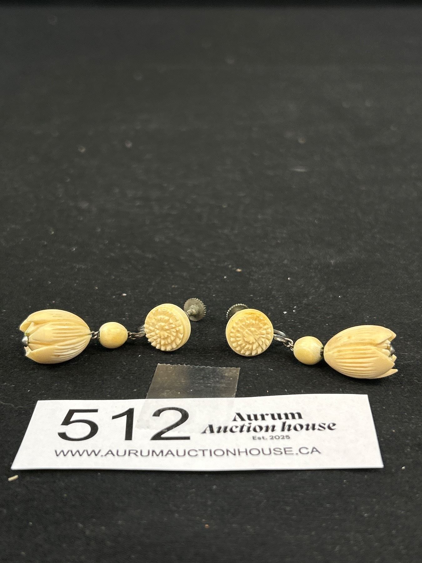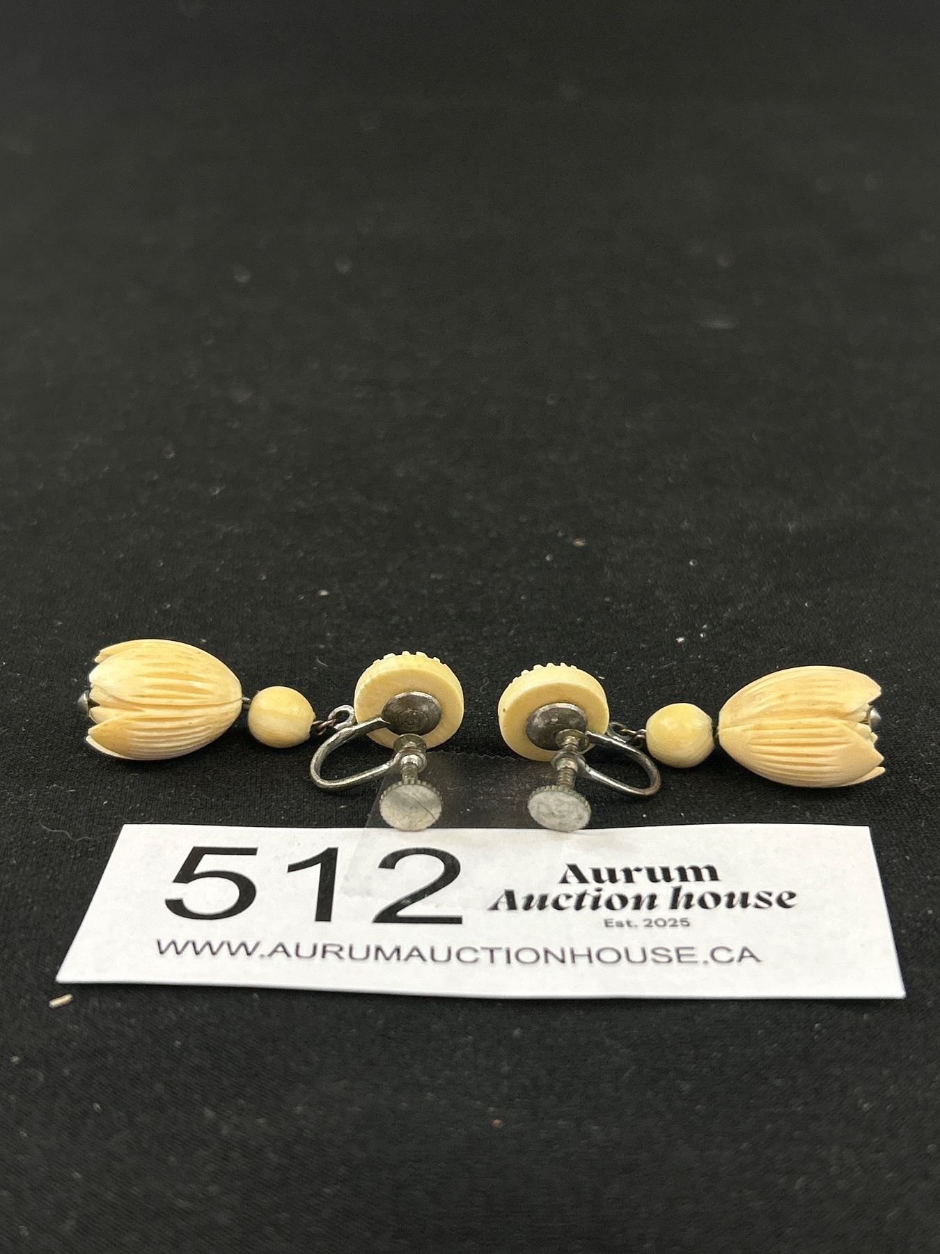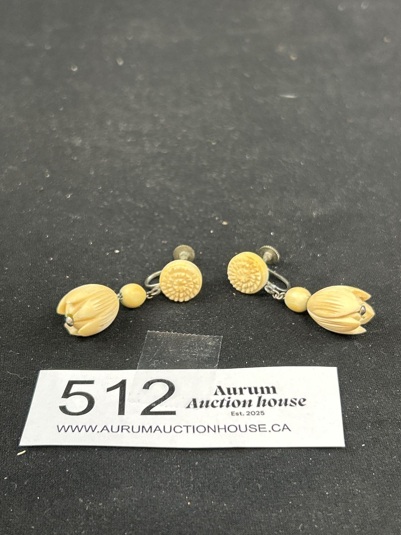 Pair of Antique Hand Carved Bone or Ivory Screw on Earrings